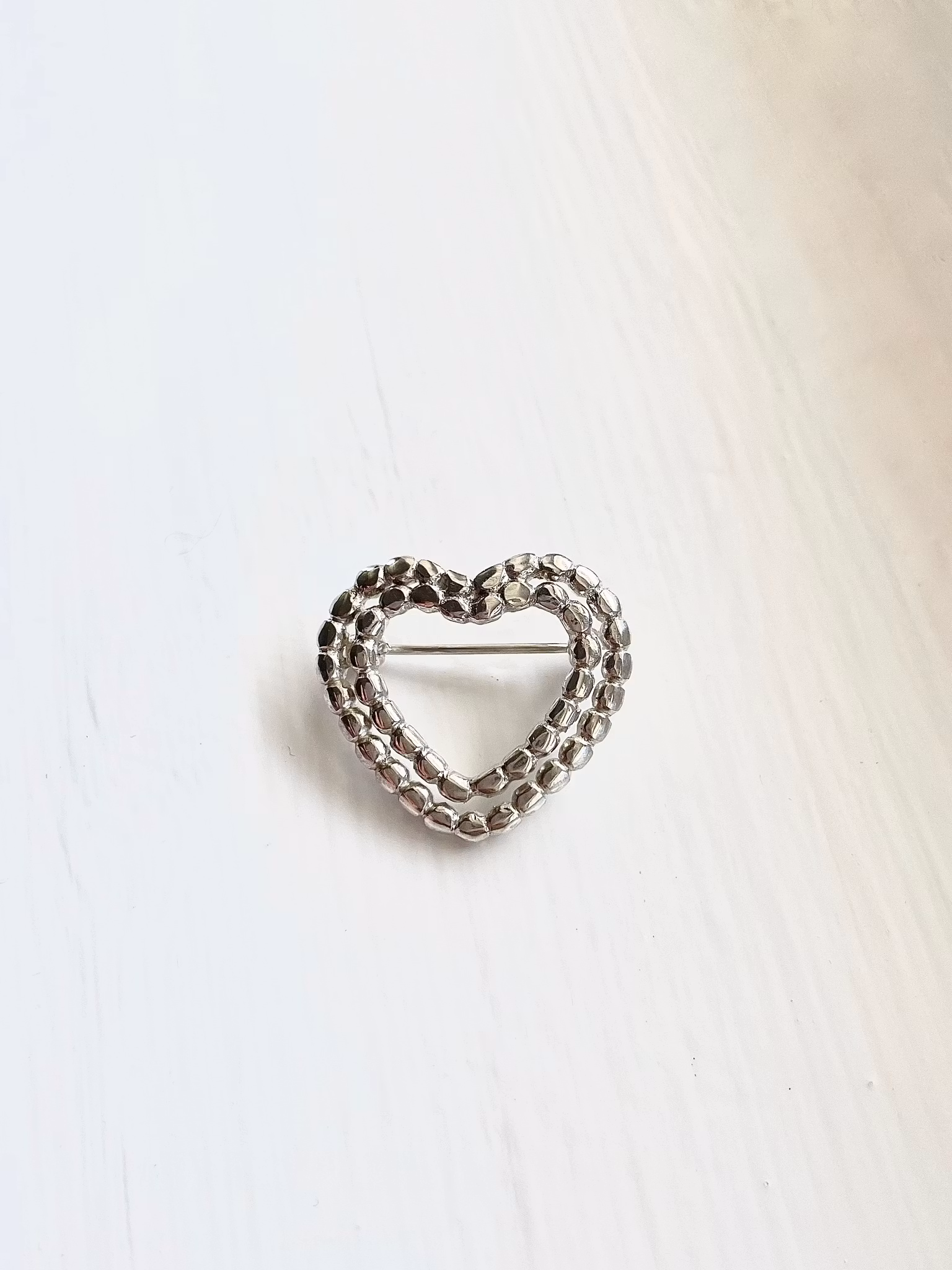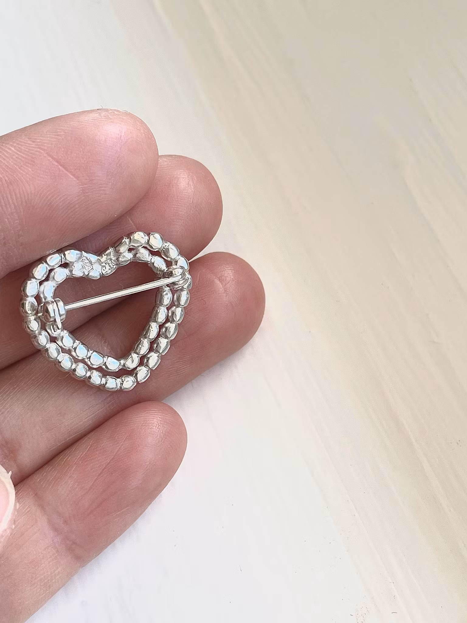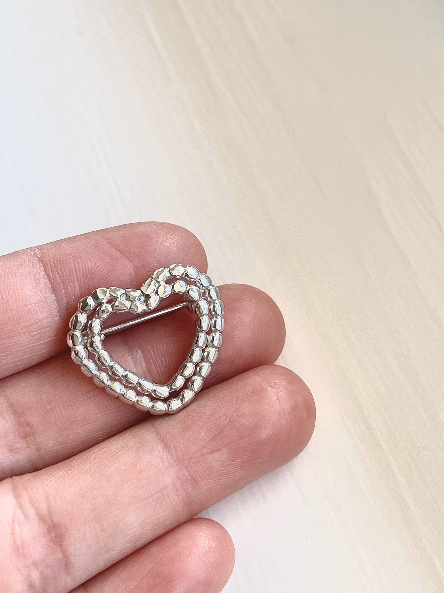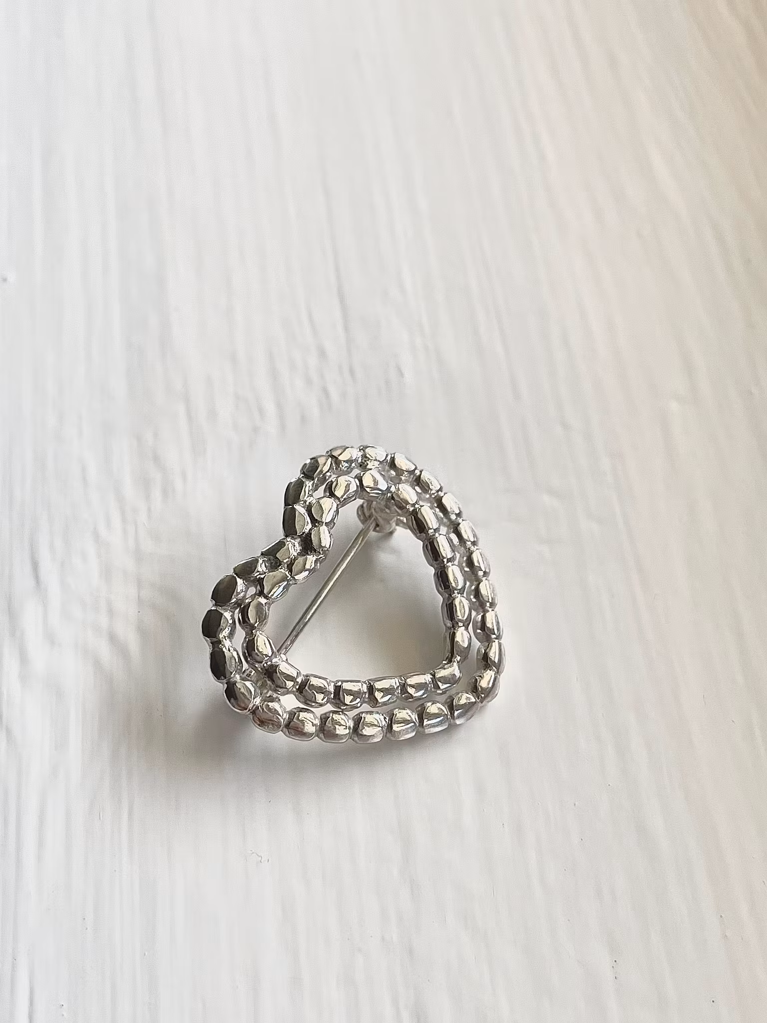 Brosch i hjärtform, simpelt design, modernt och lekfullt med säkerhetsfäste på baksida. Passar till allt från, t-shirts, tröjor eller till jackor. Tillverkad för hand i återvunnet sterling silver.