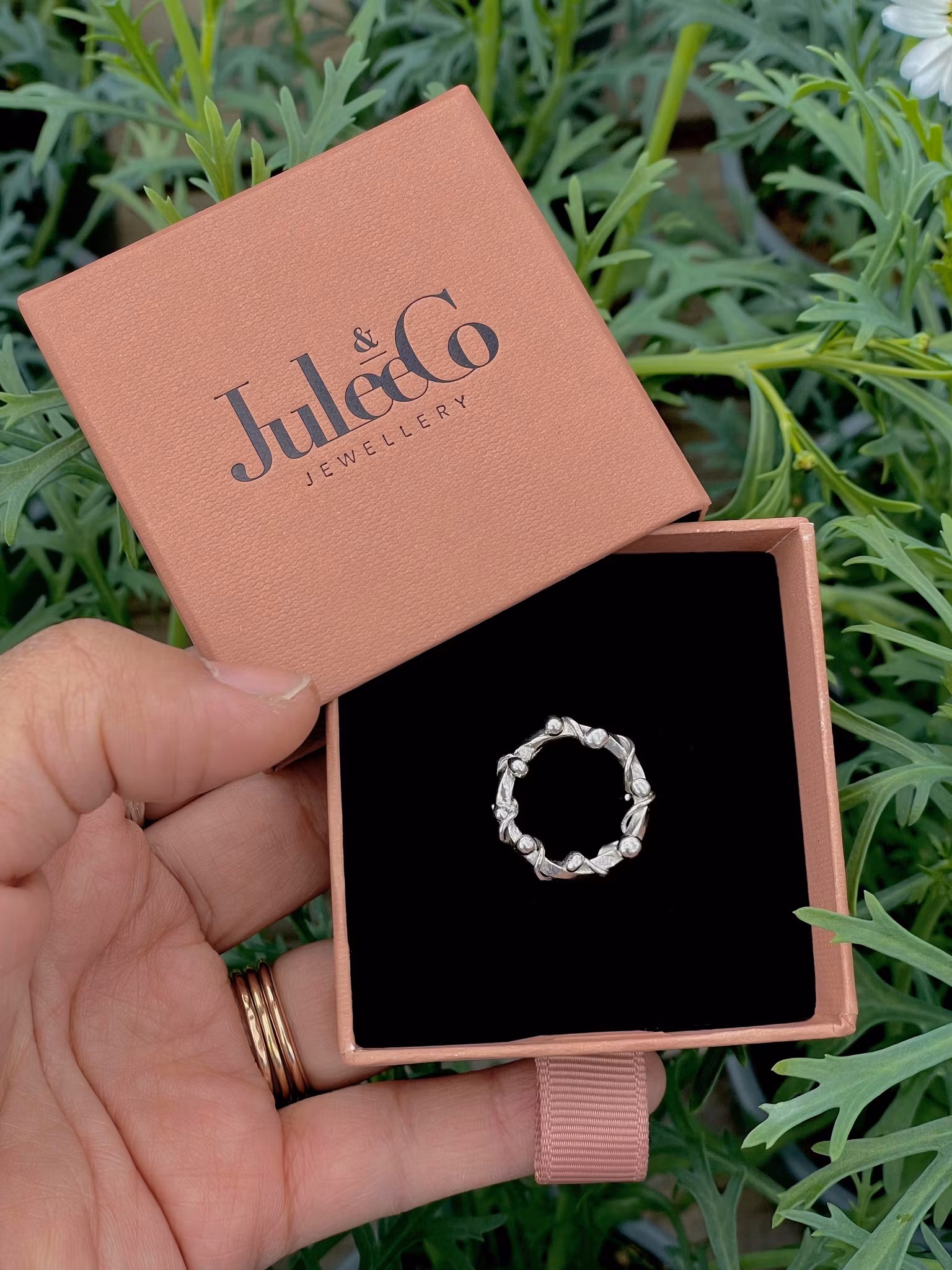 En liten modern brosch i organisk form med säkerhetsfäste på baksidan. Broschen är inspirerad av en krans, ett detaljrikt design med en vriden tråd som bas och ett mindre silvertråd som klänger sig runt kransen, som körsbären på toppen är de små smälta silverbollarna.