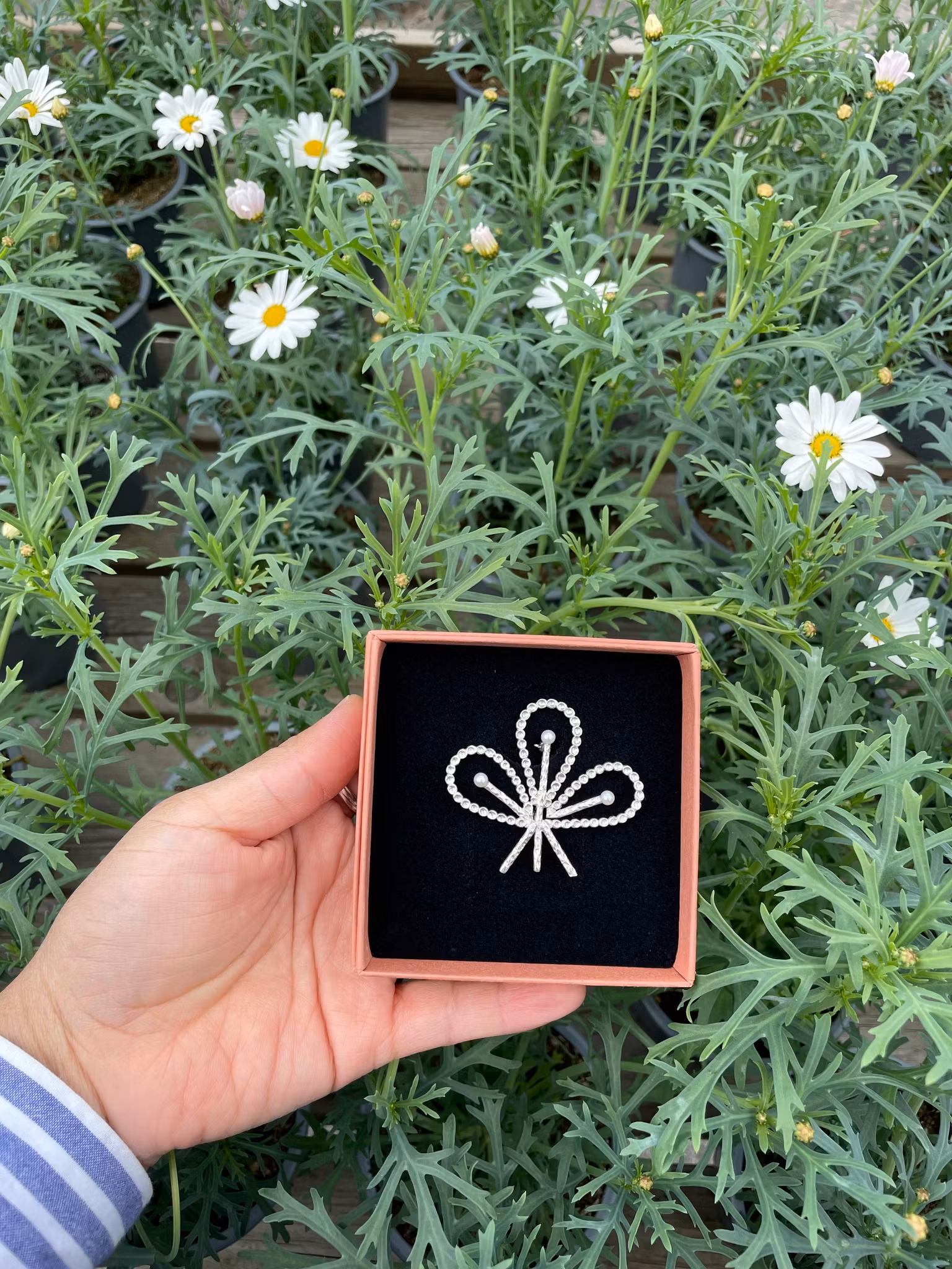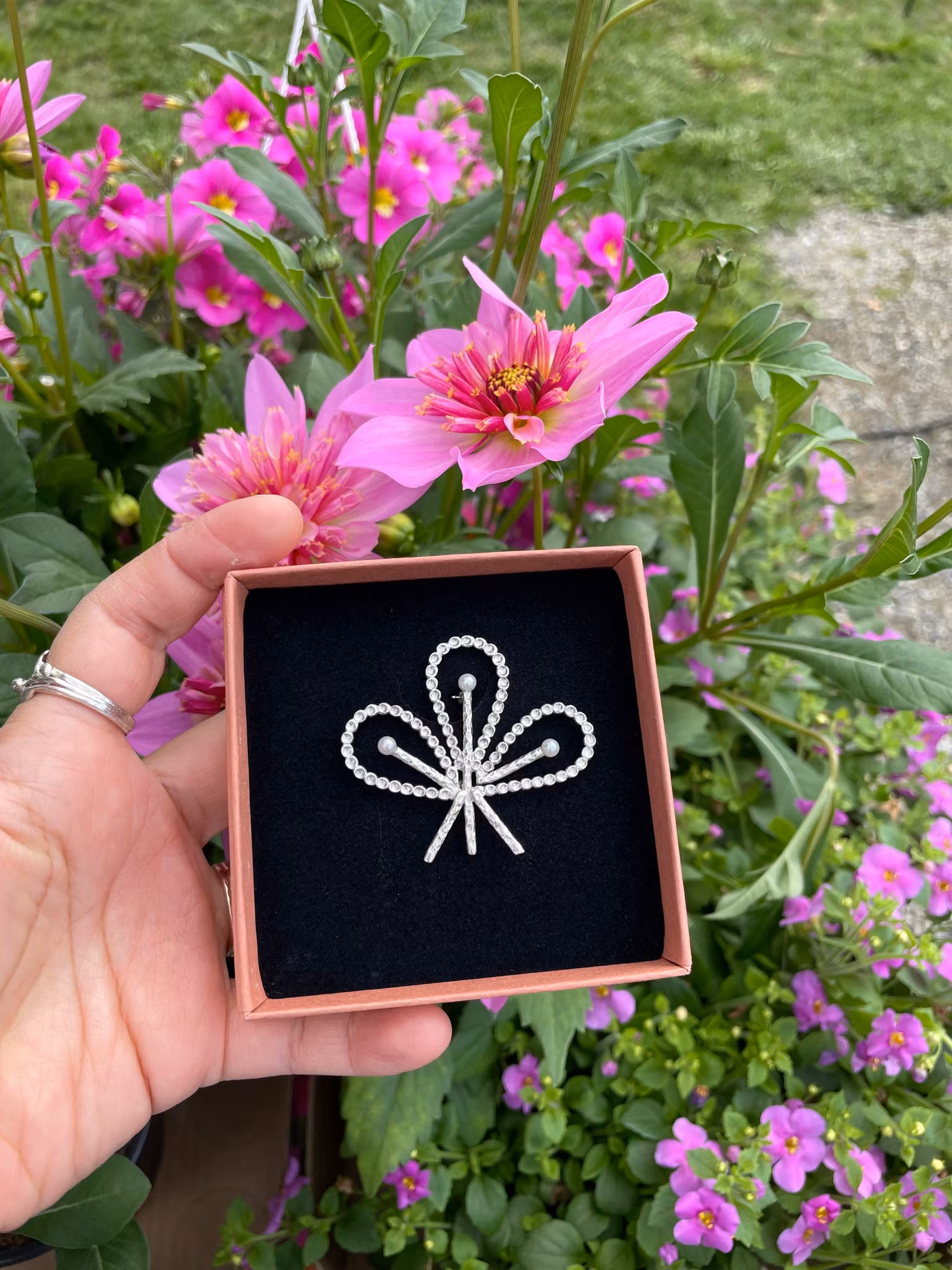 En unik modern brosch inspirerad av påfågel fjäder, rik på detaljer med små söta odlade pärlor. Passar till klänningar, kavajer eller på en tröja för att skapa intressant look! Handarbetat i varje detalj, broschnål på baksidan med enkelt lås för säker fästning på kläder. Finns endast i ett exemplar!