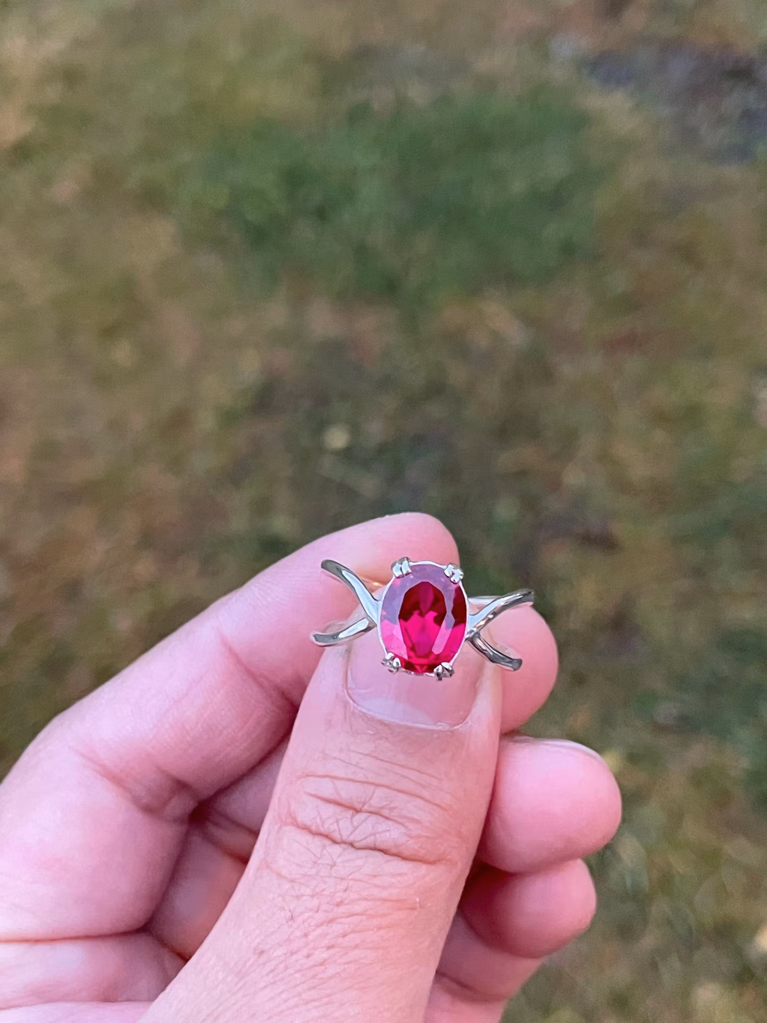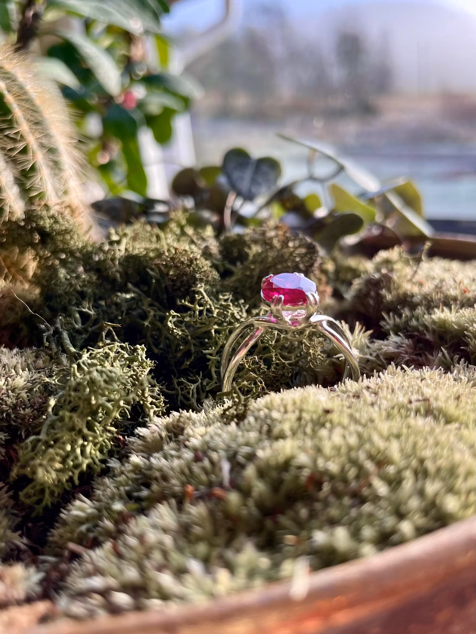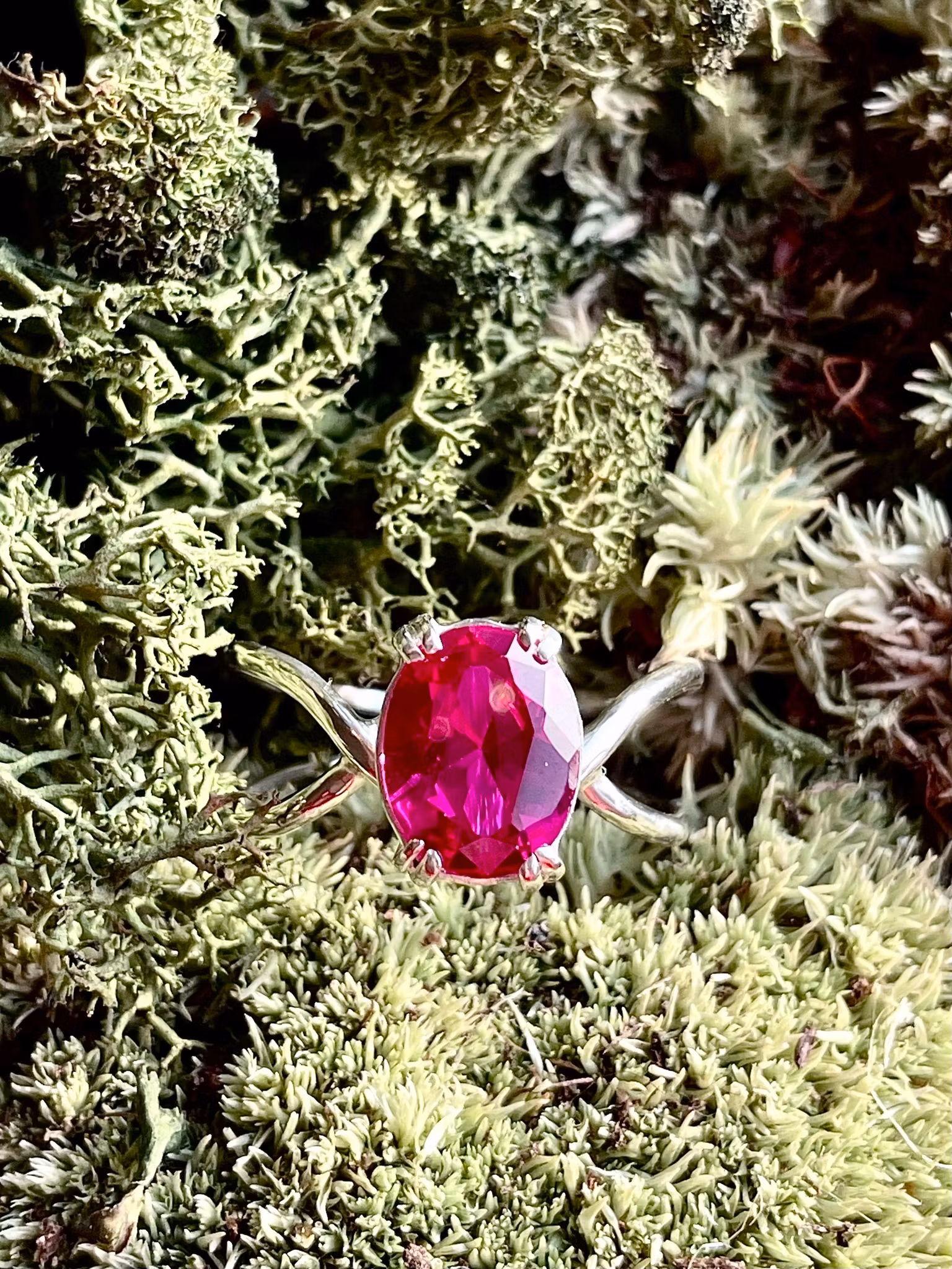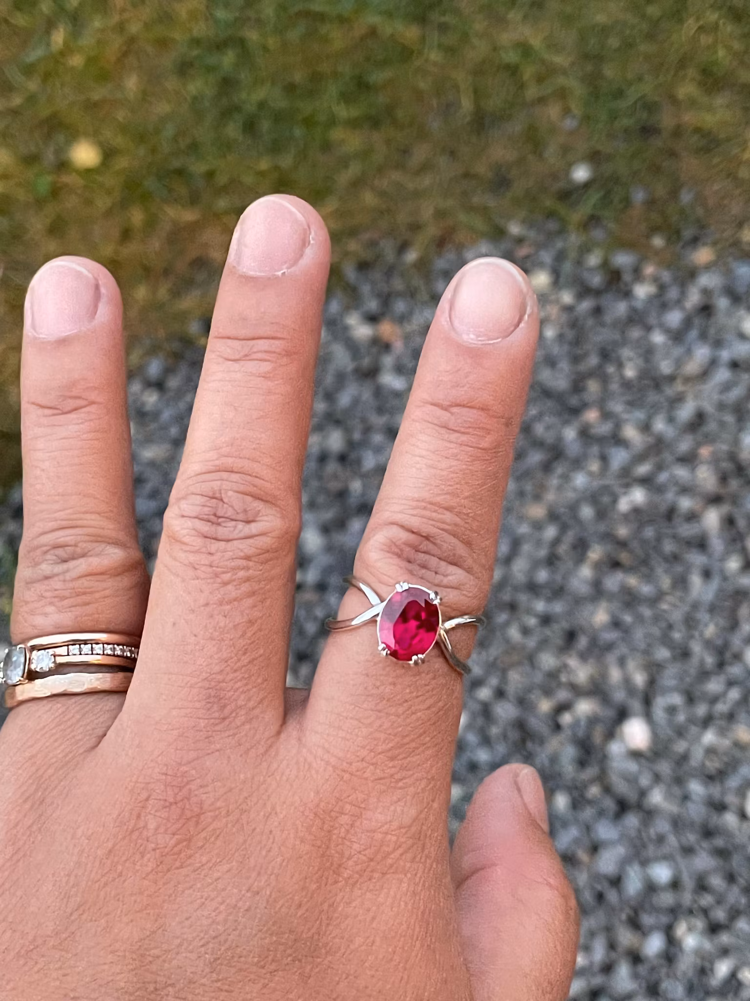 En ring som är vackert från alla håll, enkelt och elegant ring med en stor oval röd sten du kan ha på dig varje dag.