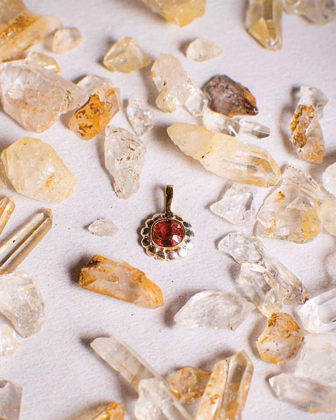 Guldhänge i återvunnet 18k guld med 0,7ct slipad orang-röd spinell från Myanmar (f.d. Burma). Ädelstenen slipad i kuddform och är dekorerad med sterling silver för kungligt antik utseende. Fördelen med denna typ av steninfattning är att den funkar som skalskydds för stenen och dessutom mycket bekvämt att bära då den inte fastnar på kläder.