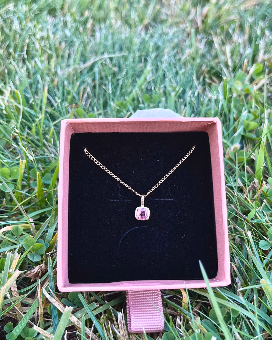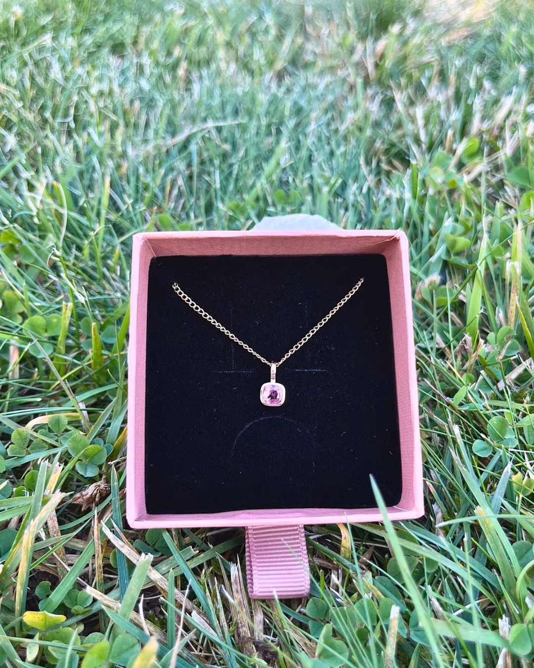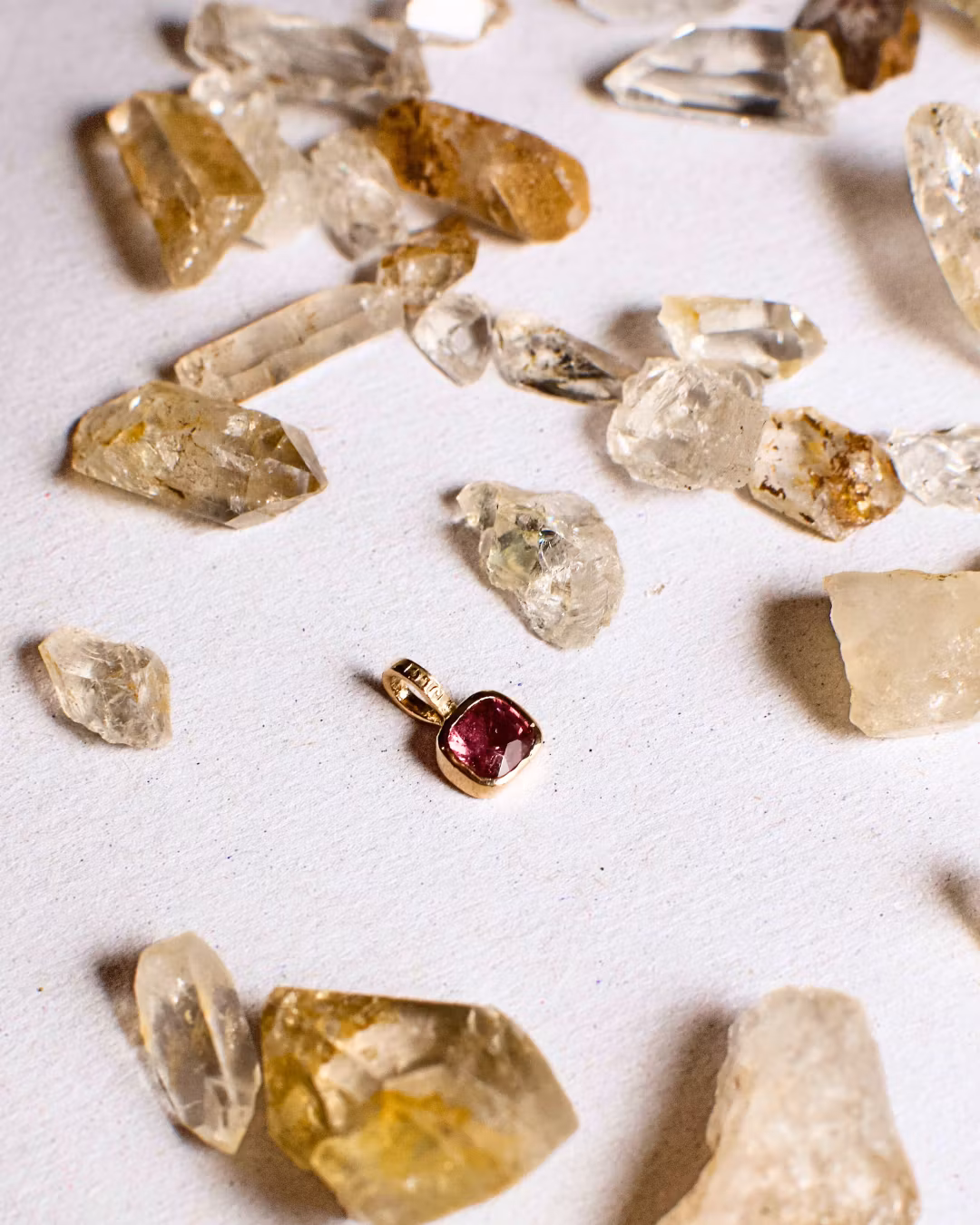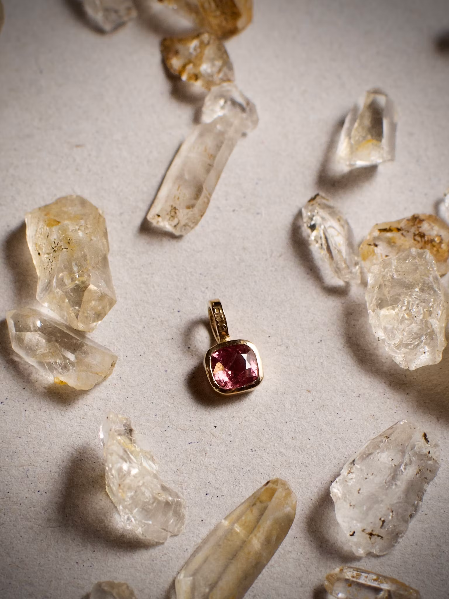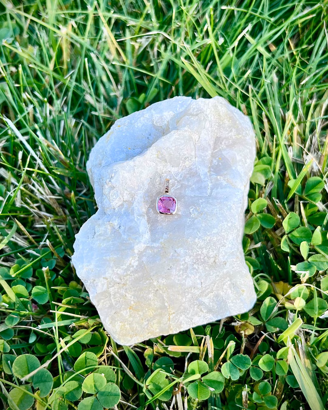 Hänge i återvunnet 18k guld med 0,54ct rosa spinell från Myanmar (f.d. Burma) slipad i kuddform och infattat utan klor för minimalistisk look. Fördelen med denna typ av steninfattning är att den funkar som skyddsskal för stenen och dessutom fastnar den inte i tröjor eller filtar.