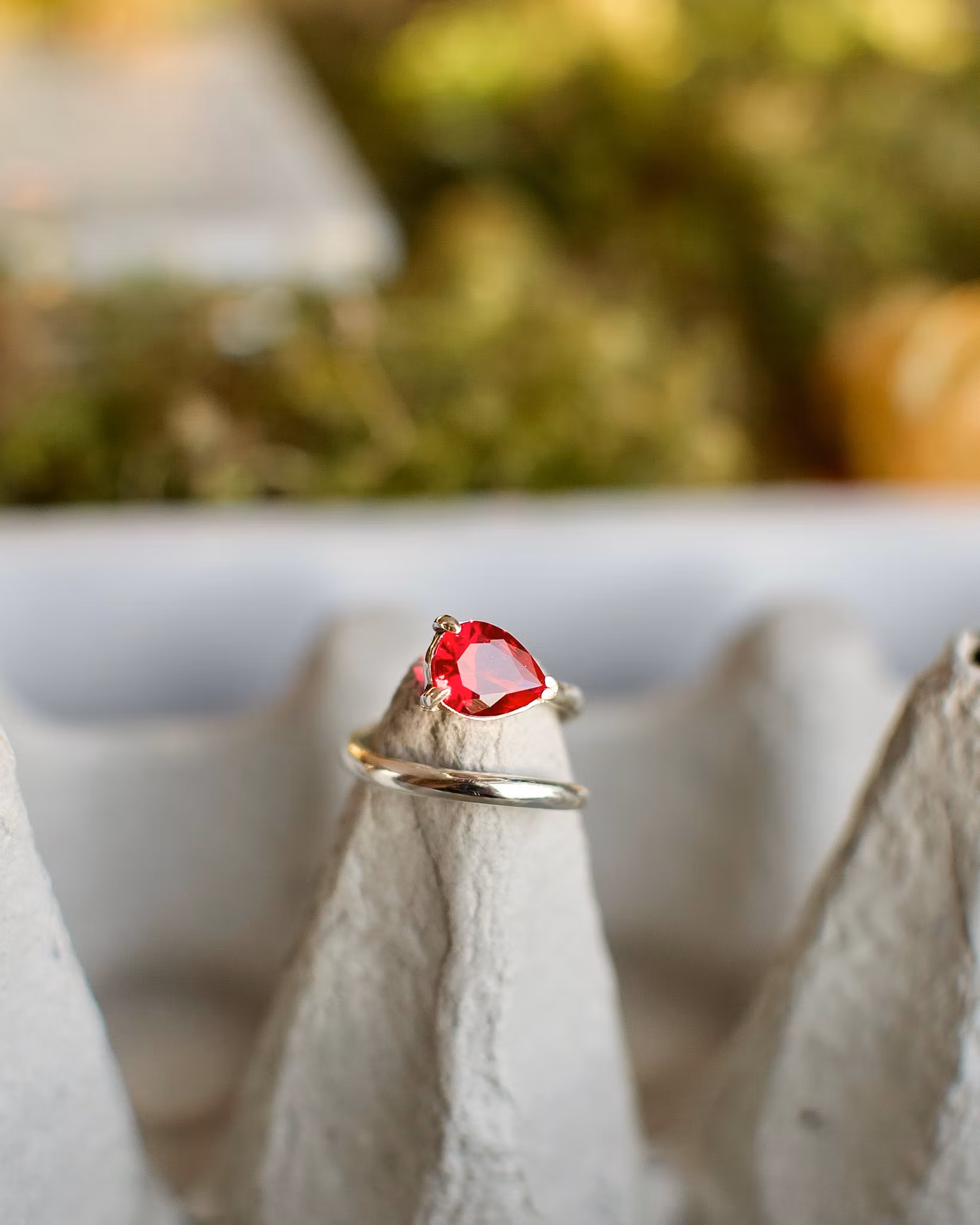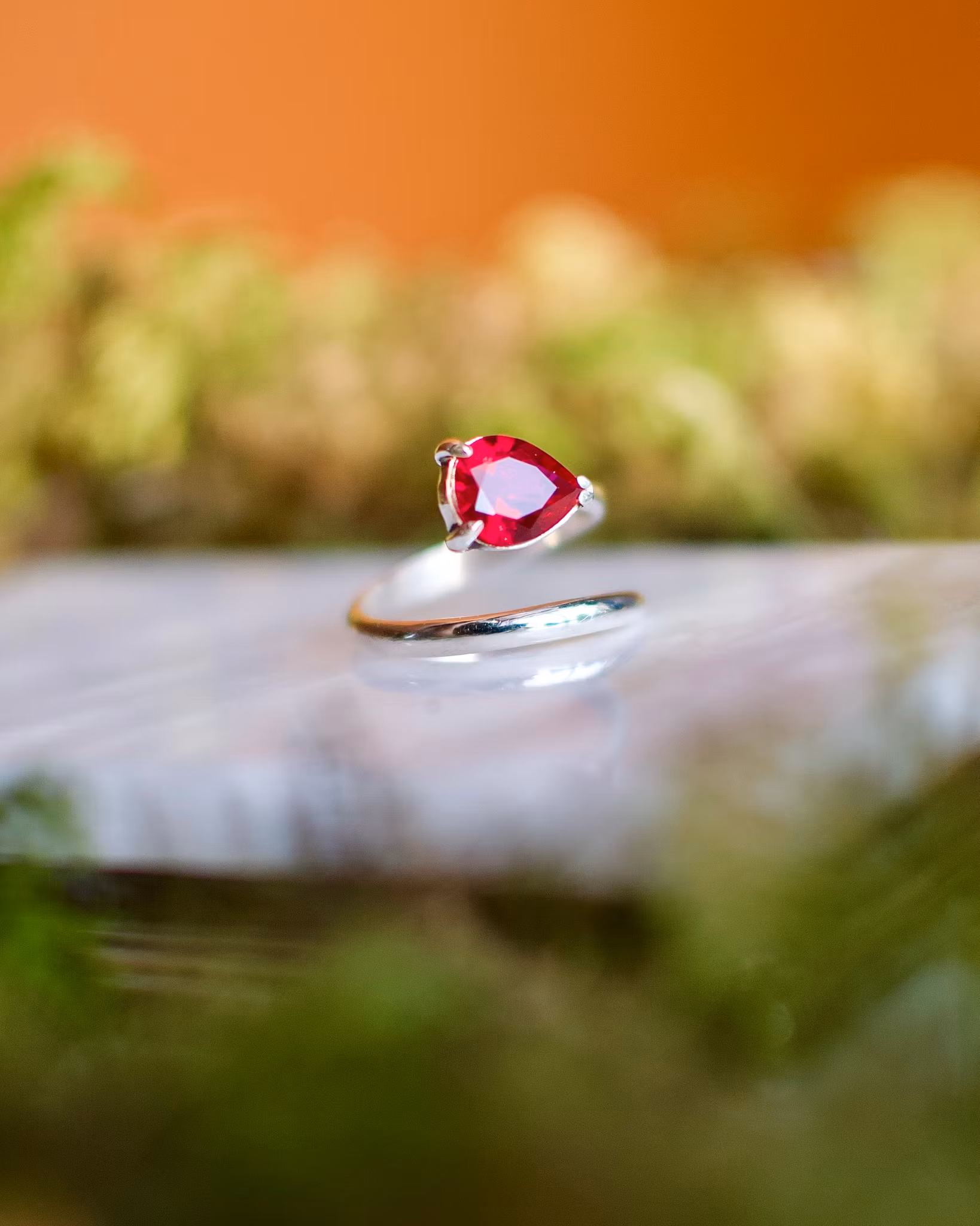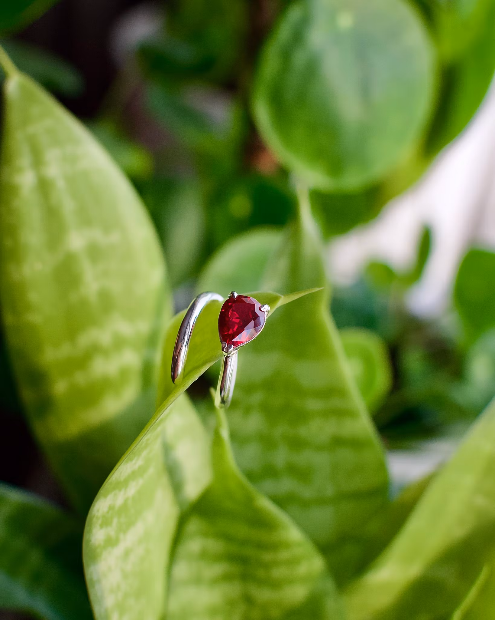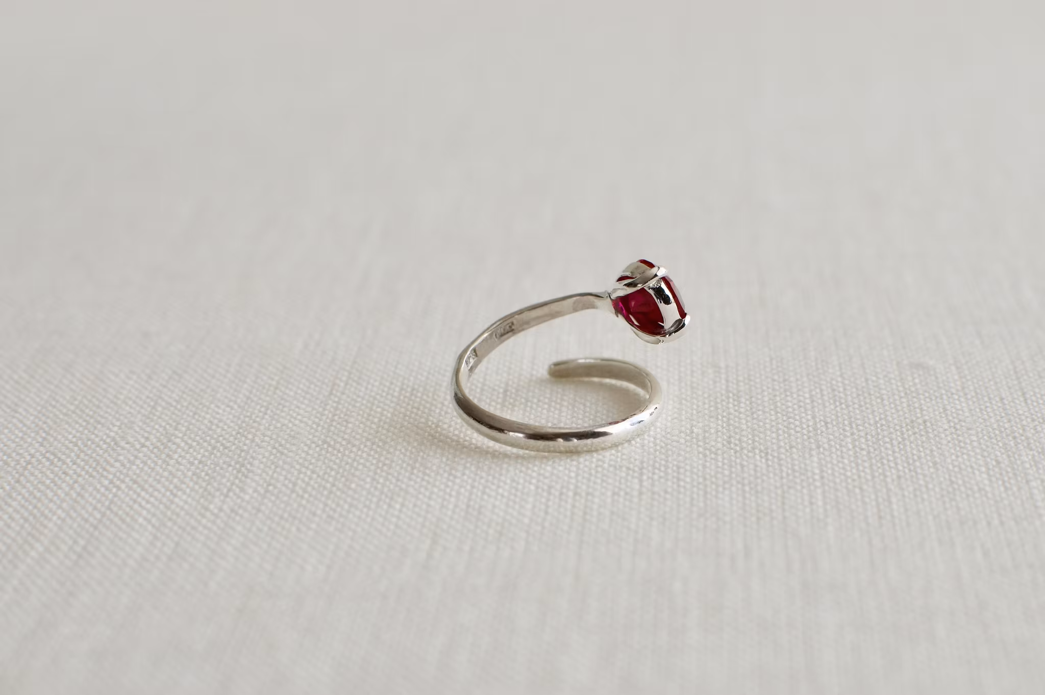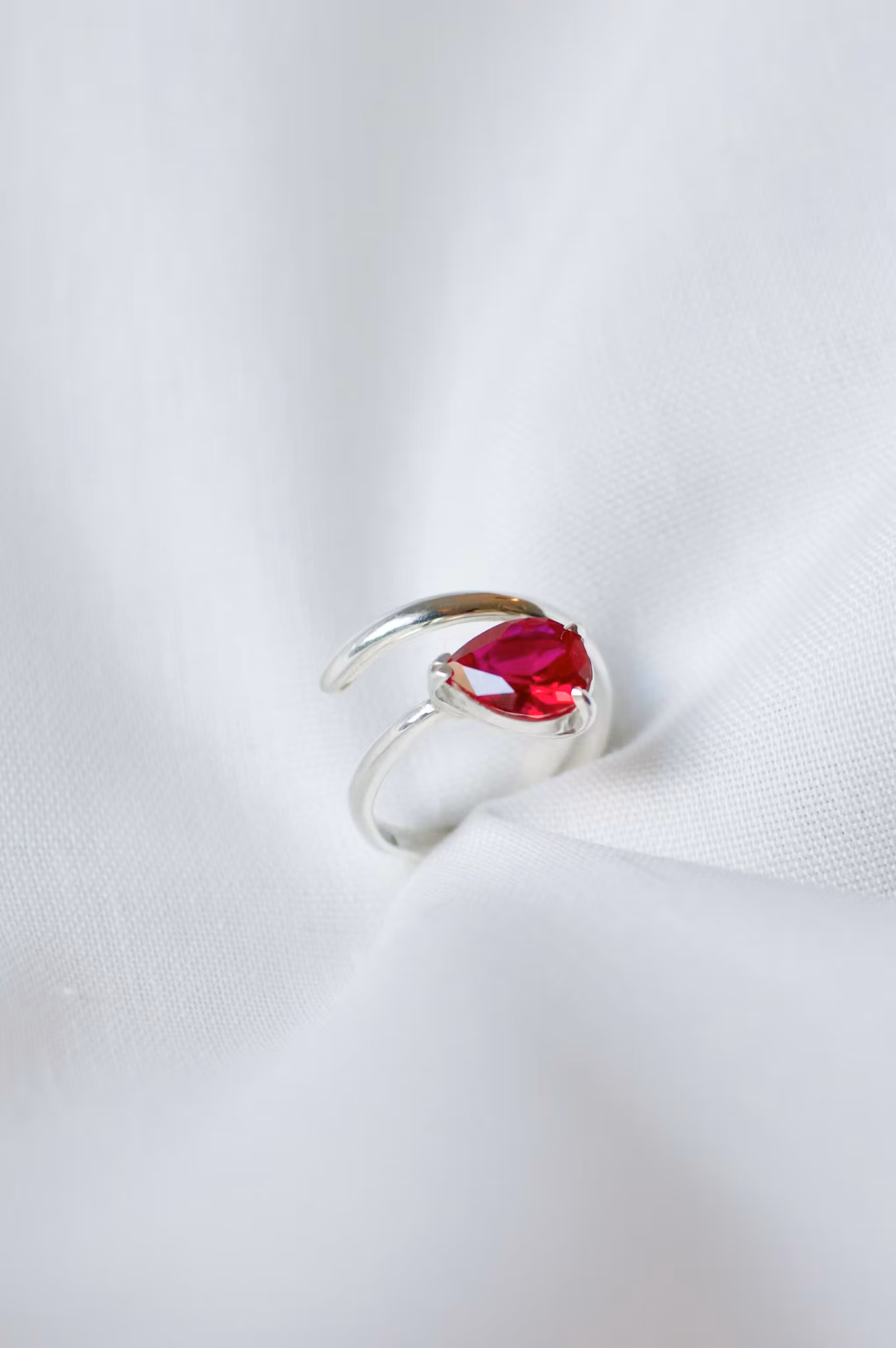 En öppen ring inspirerad av rosen taggar i sterling silver med laboratorium tillverkade blodröda stenar. Modern och karaktäristisk ring i minimalistisk utformning. Unik ring för en unik person.