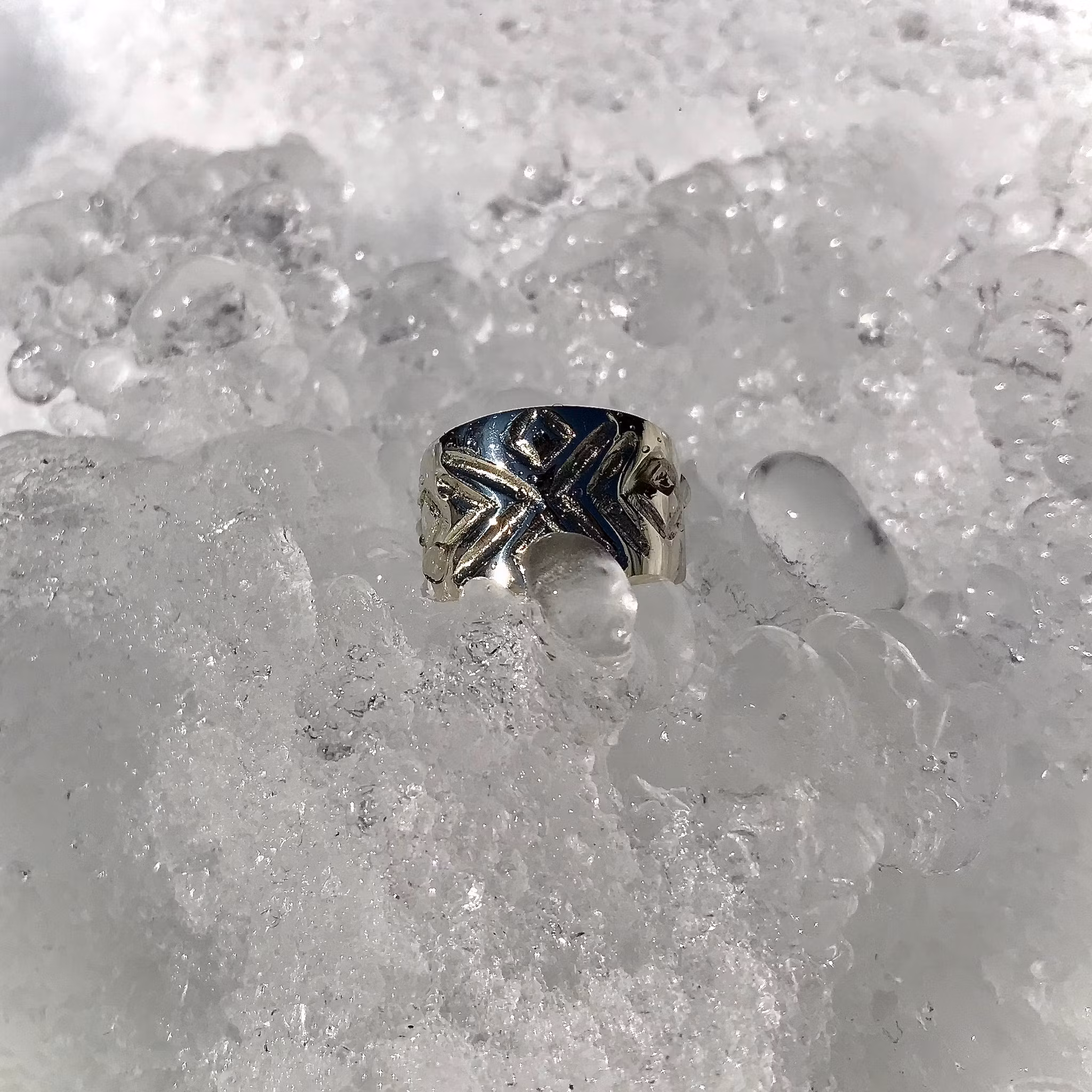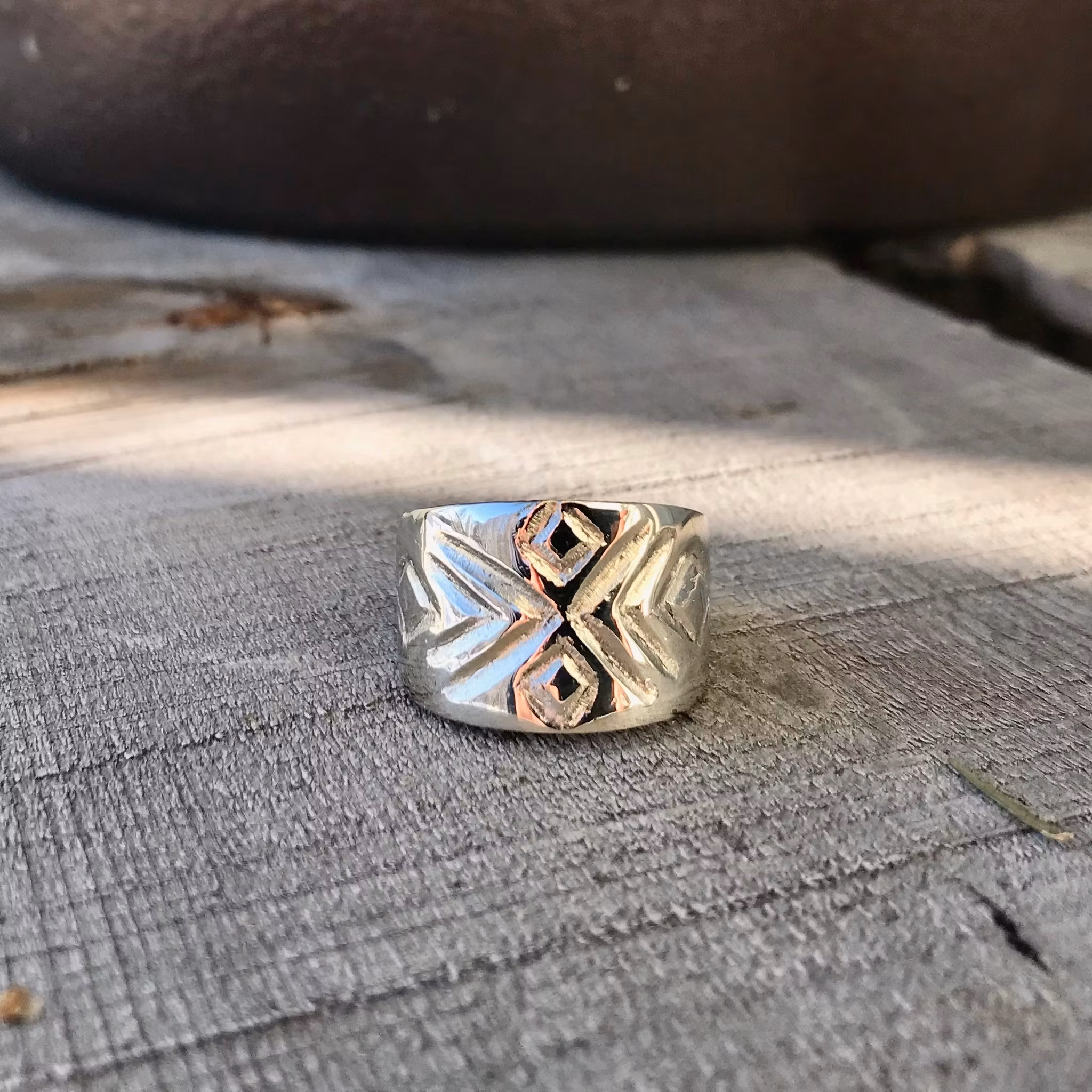 En ring inspirerad av Chin etnisk mönster, karvad för hand, bred i mitten men smal på baksidan vilket gör ringen bekvämt att bära den trots sin mått (10x1,5 mm).