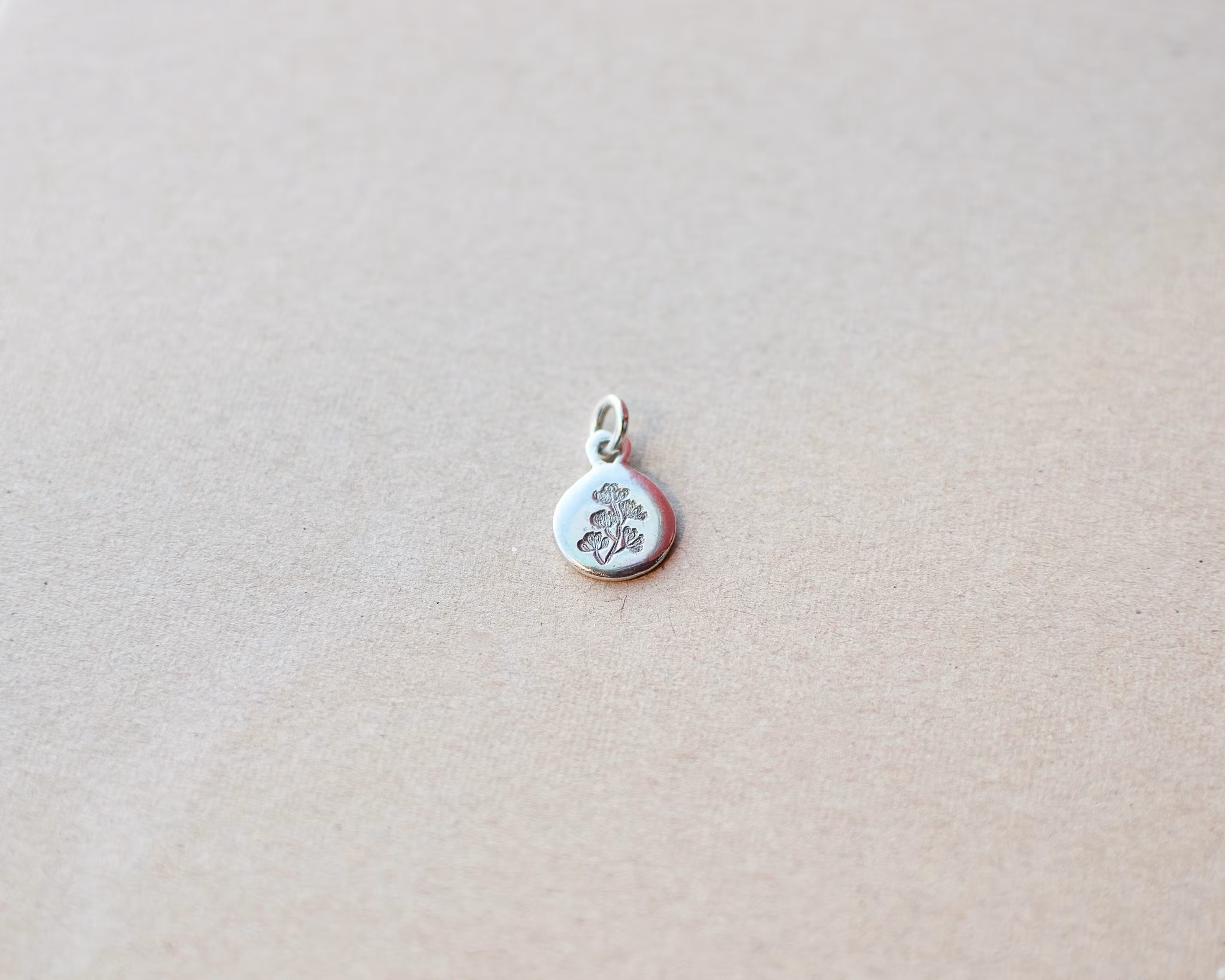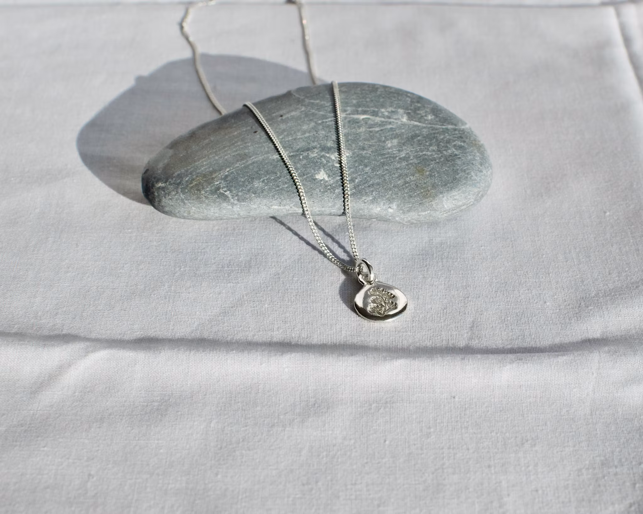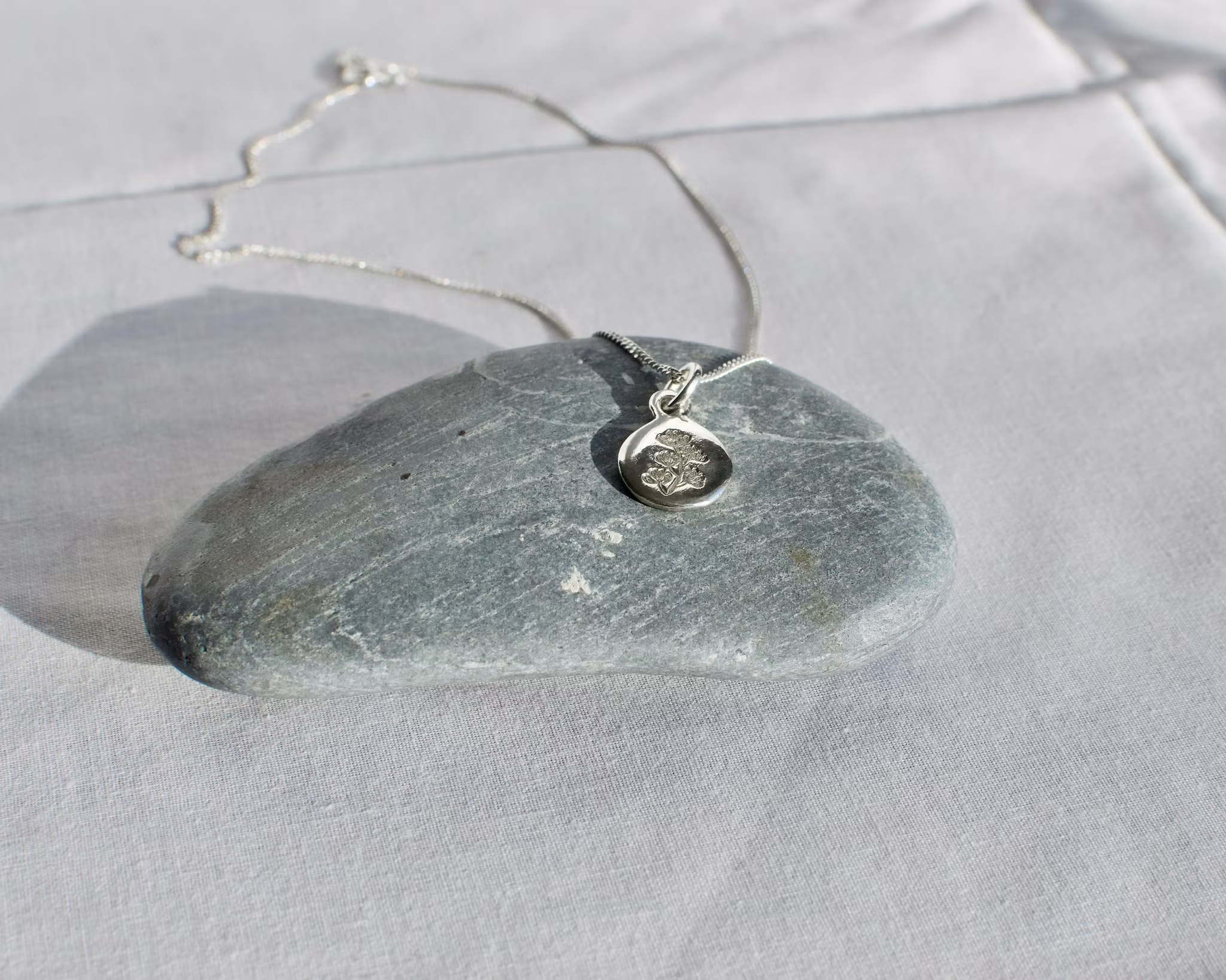 Tjockare hänge med stämplad motiv av dillblommor i smält silverplatta i organisk form. Går att gravera eller rista in initialer på baksidan för personligare prägel.