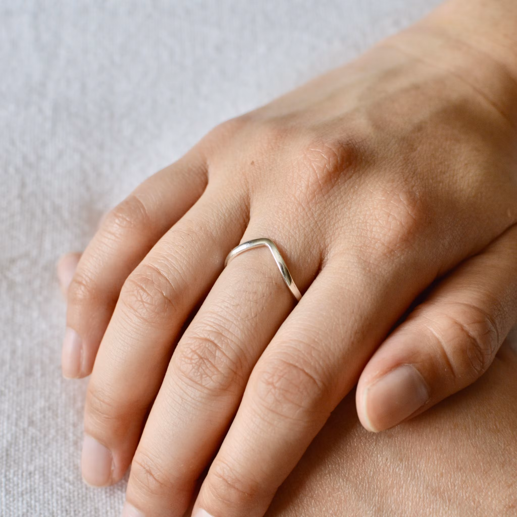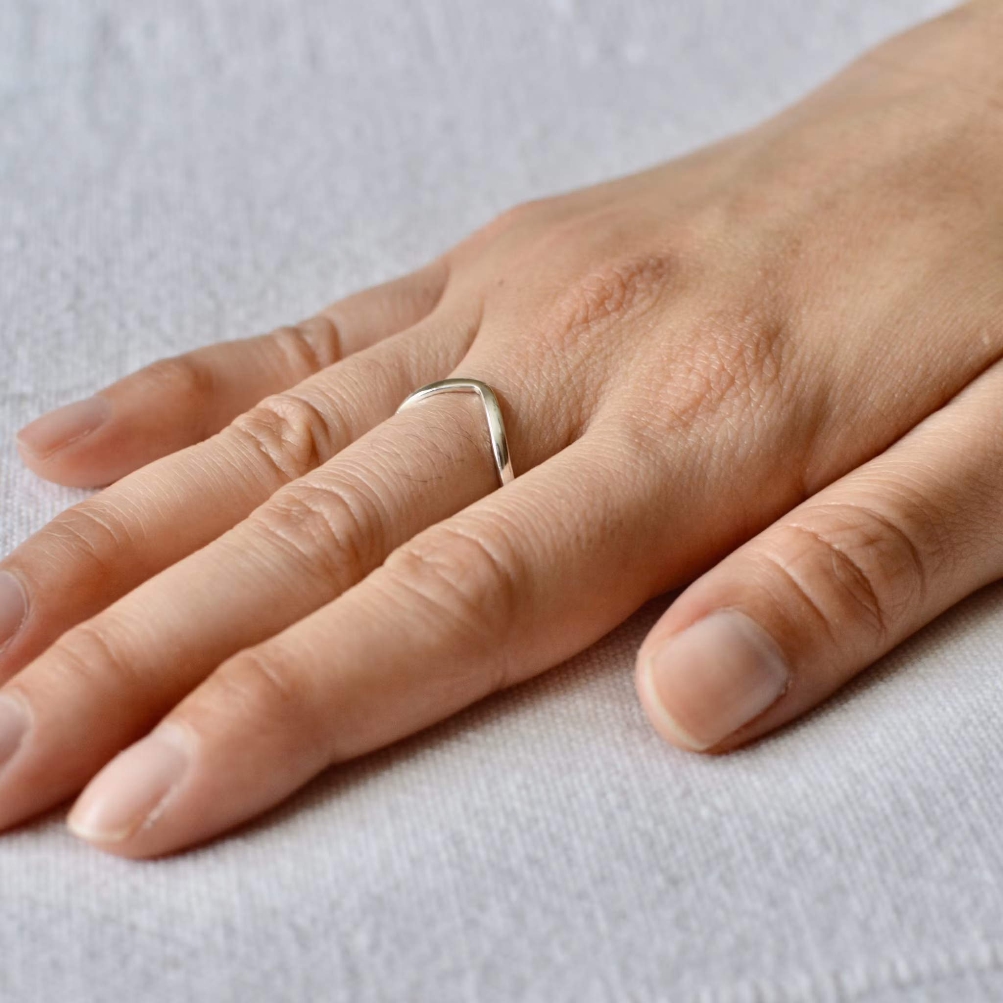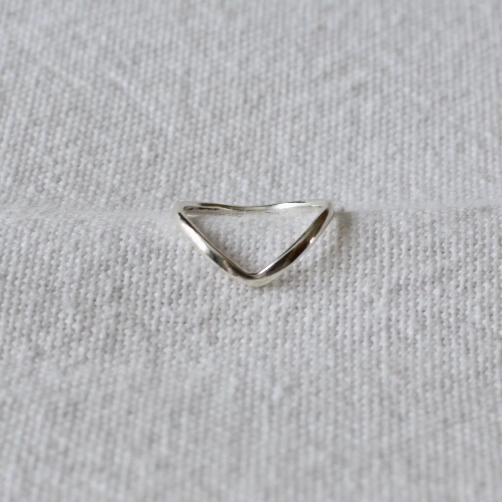 En multifunktionell V-formad ring som är perfekt att stapla med. Du kan byta stil på ringen genom att snurra på ringen, stapla med flera likadana ringar eller genom att byta hål på var spetsen ska peka! Ange önskad storlek under meddelande vid utcheckningen. Mått: 2x1,5 mm.