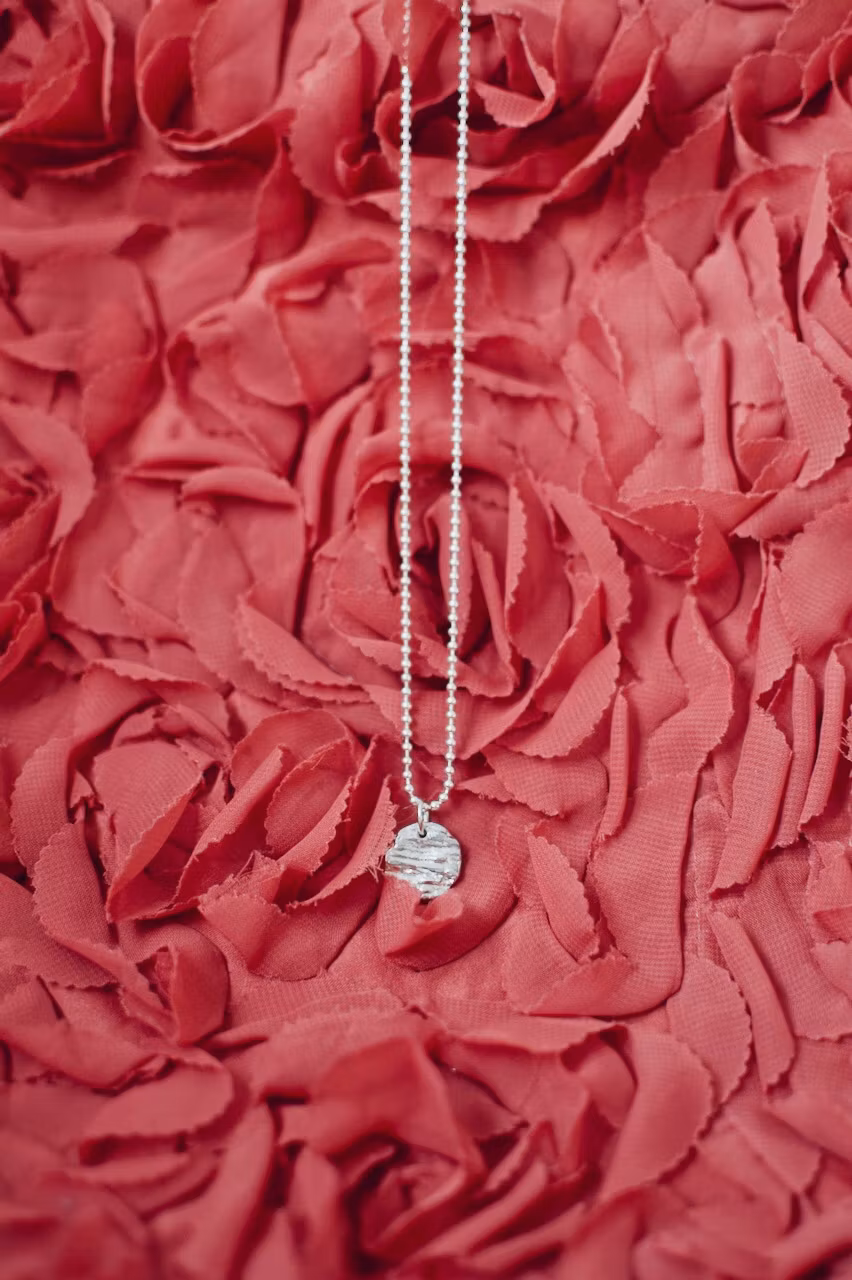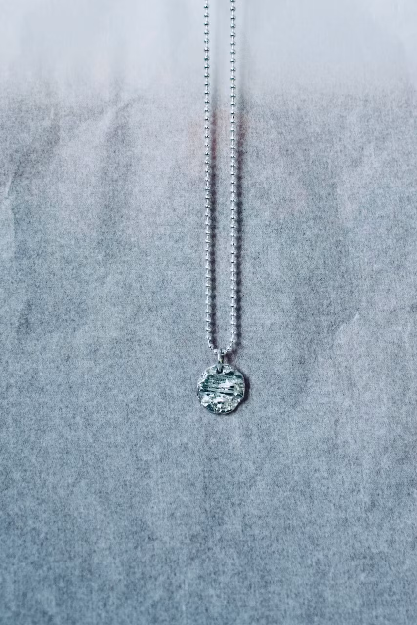 Ett unisex halsband i kulkedja samt ett tjockt hänge med textur i återvunnen sterling silver. Välj kedja mellan pansarlänk eller kulkedja.