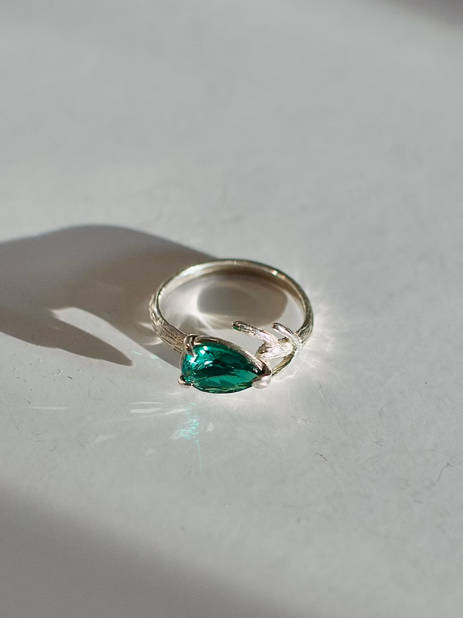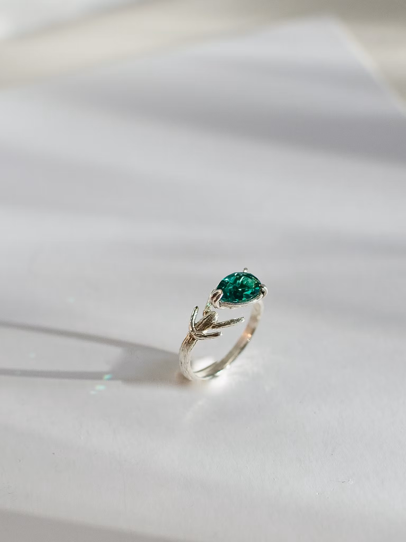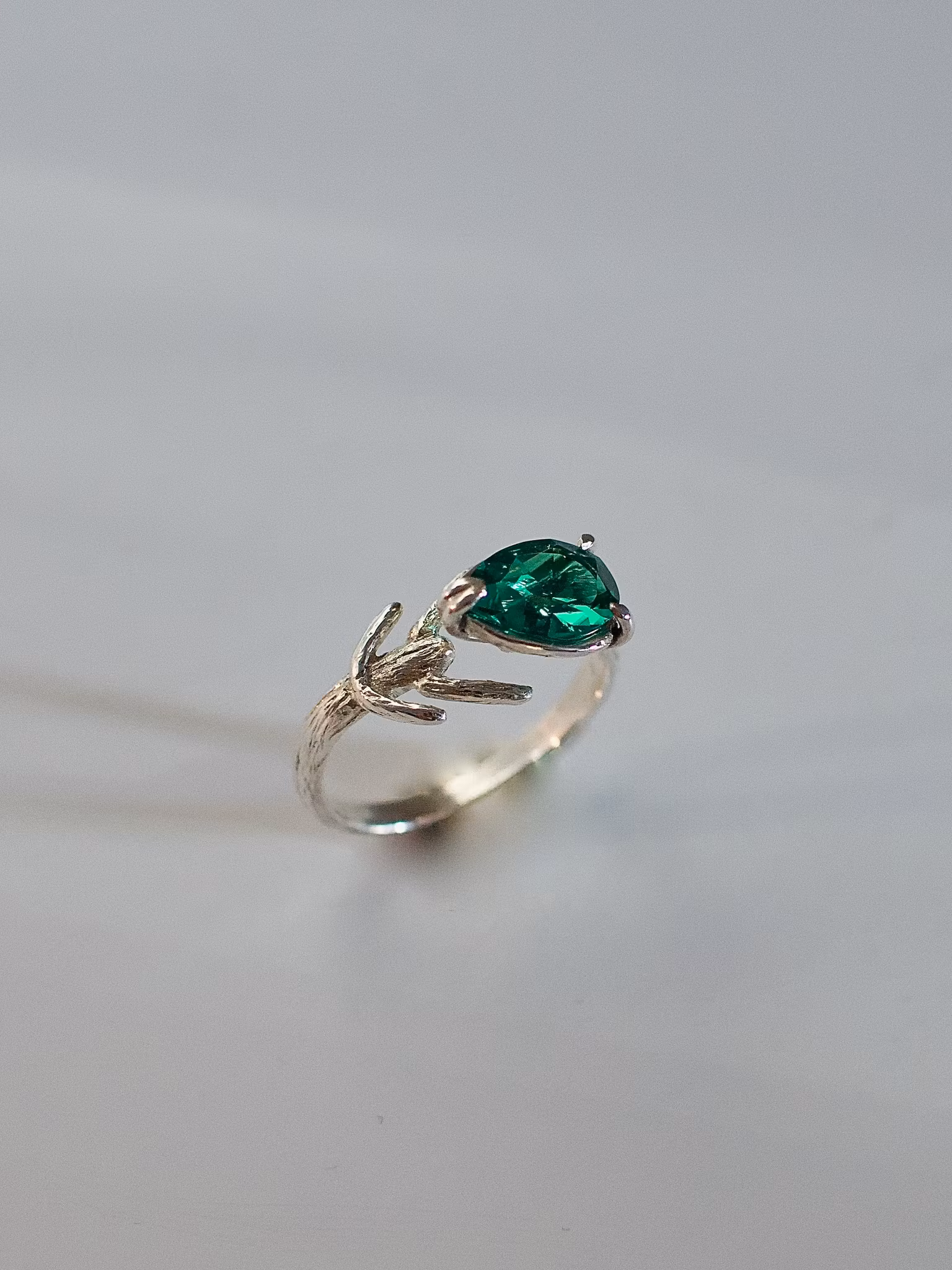 En öppen ring i sterling silver med syntetisk (lab-tillverkad) sten i smaragd grönfärgad inspirerad av Medelpads landskapsblomma: gran och kotte.