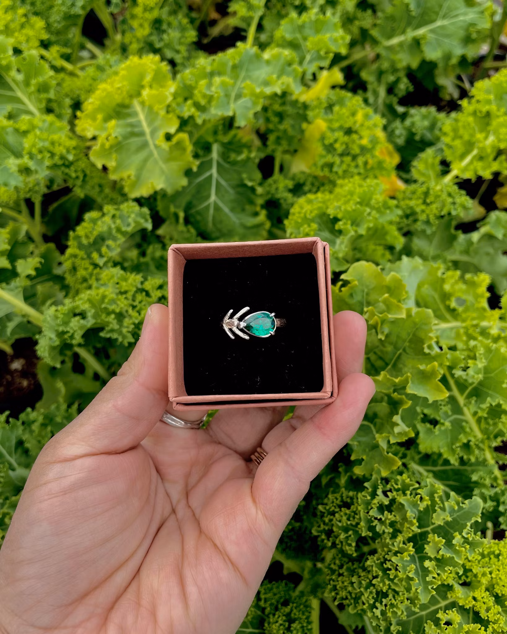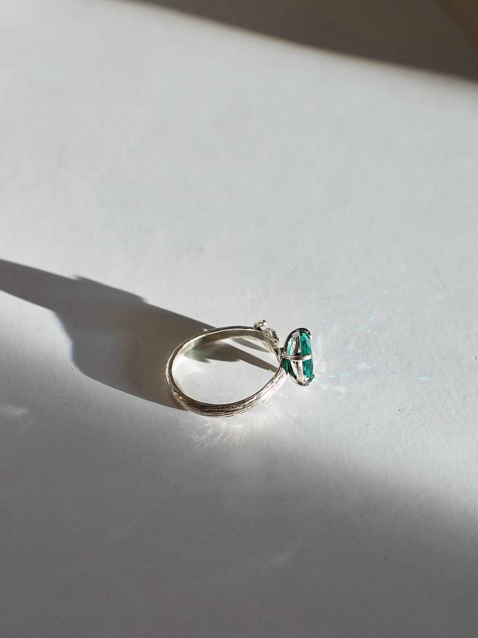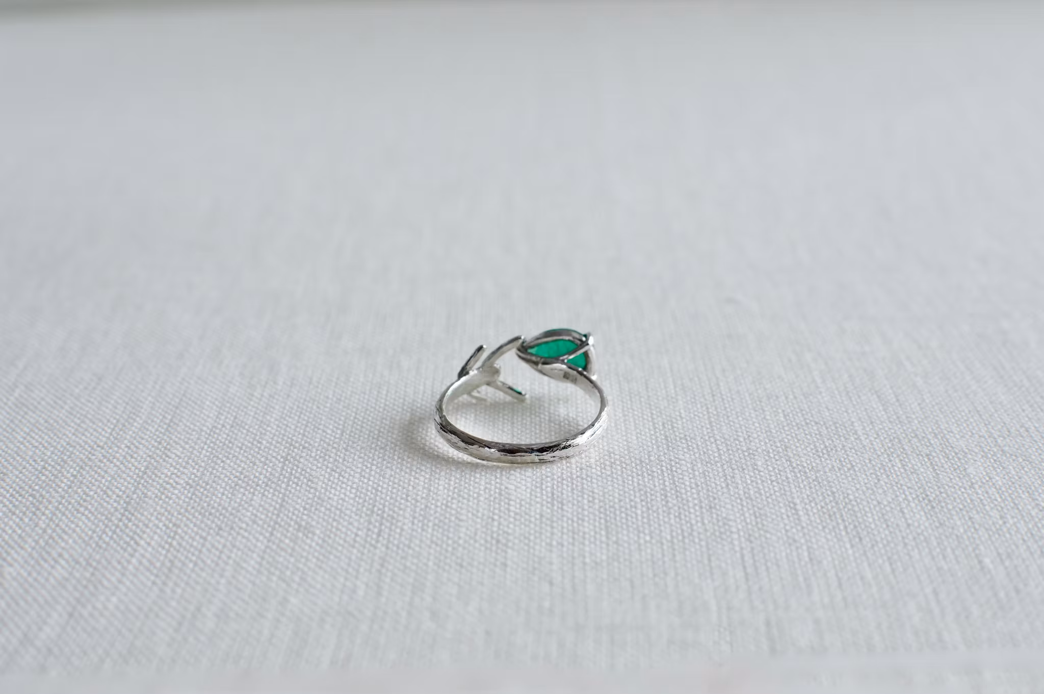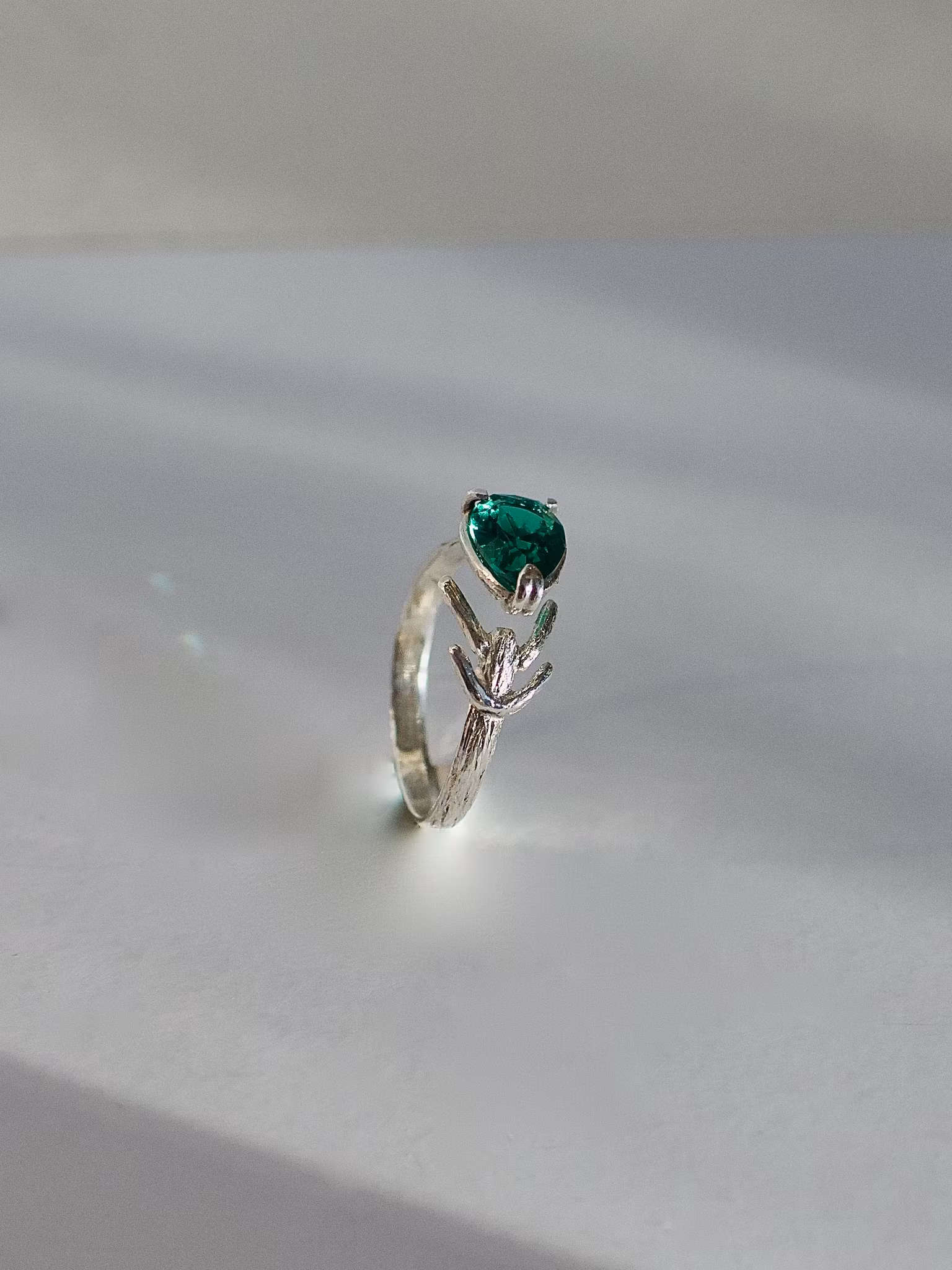 En öppen ring i sterling silver med syntetisk (lab-tillverkad) sten i smaragd grönfärgad inspirerad av Medelpads landskapsblomma: gran och kotte.