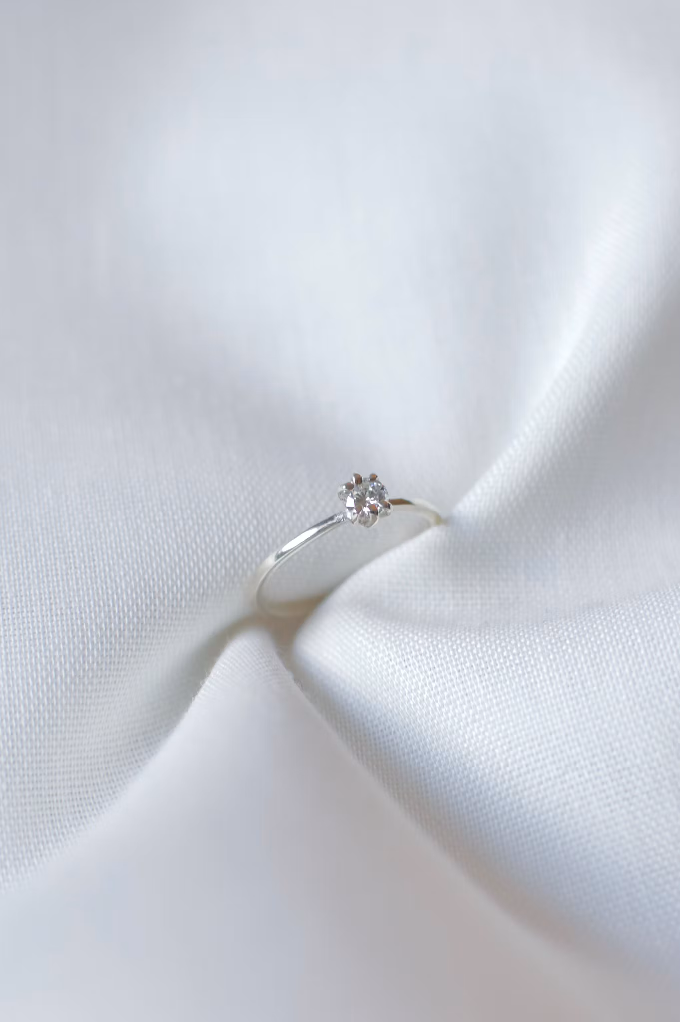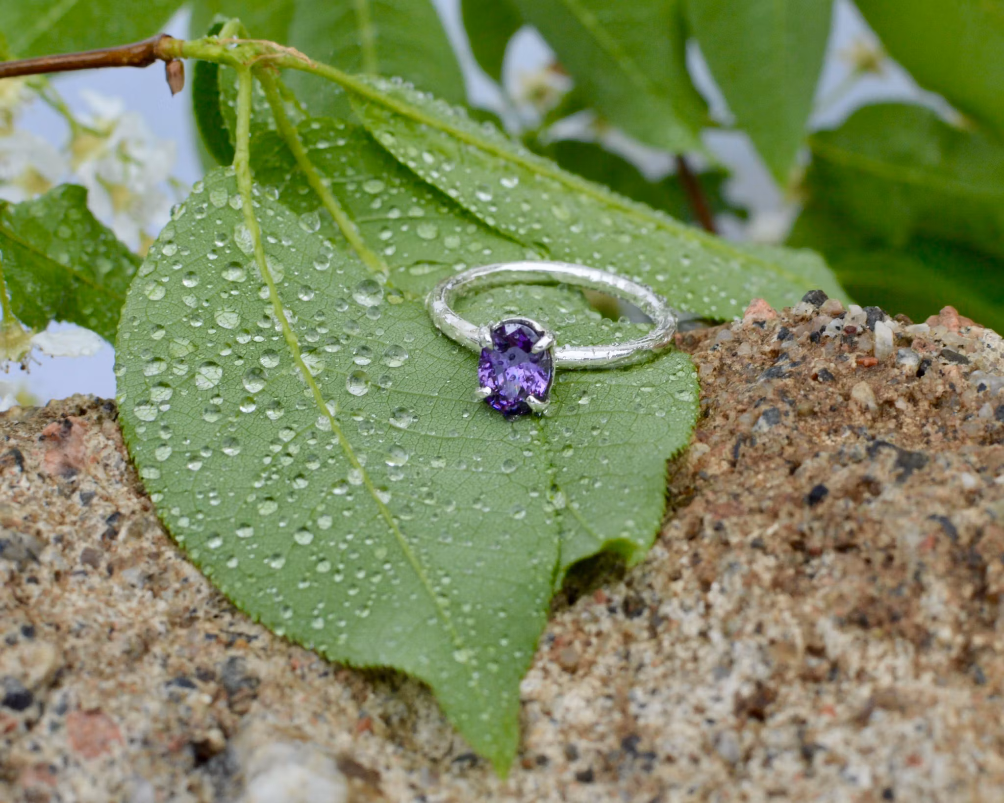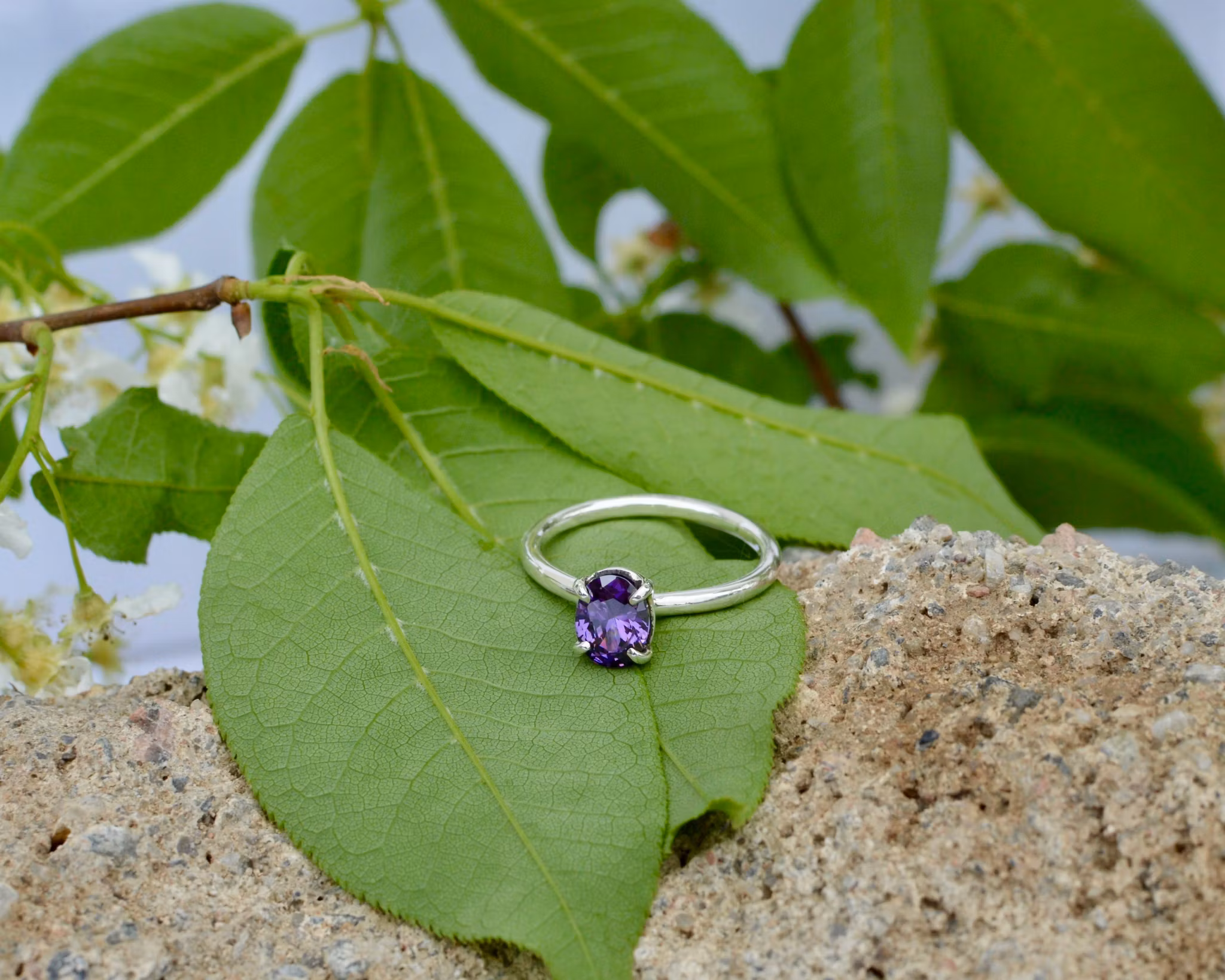 En ring för att fira milstolpe med, som present eller kanske som en förlovningsring? Ringen är gjord av sterling silver och laboratorium tillverkad sten av kubisk zirkonia. Stenarna finns tillgängliga i följande mått: Ametist lila (6X8 mm), Diamant vit rund (6mm), Rosa diamant rund (6mm).