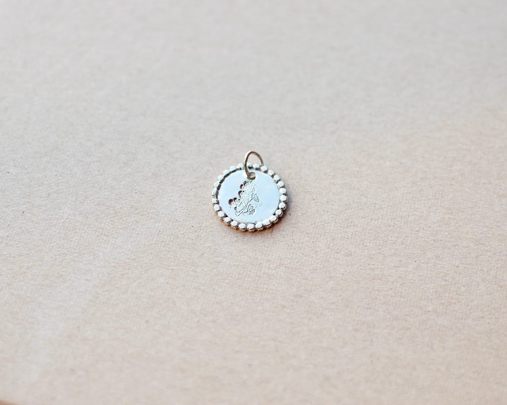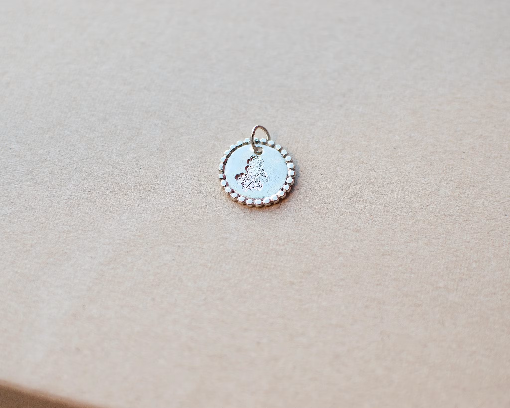 Hänge stämplad med blomstermotiv i en rund silverplatta dekorerad med små platta kulor runt kanten. Finns möjlighet att gravera in initialer på baksidan.