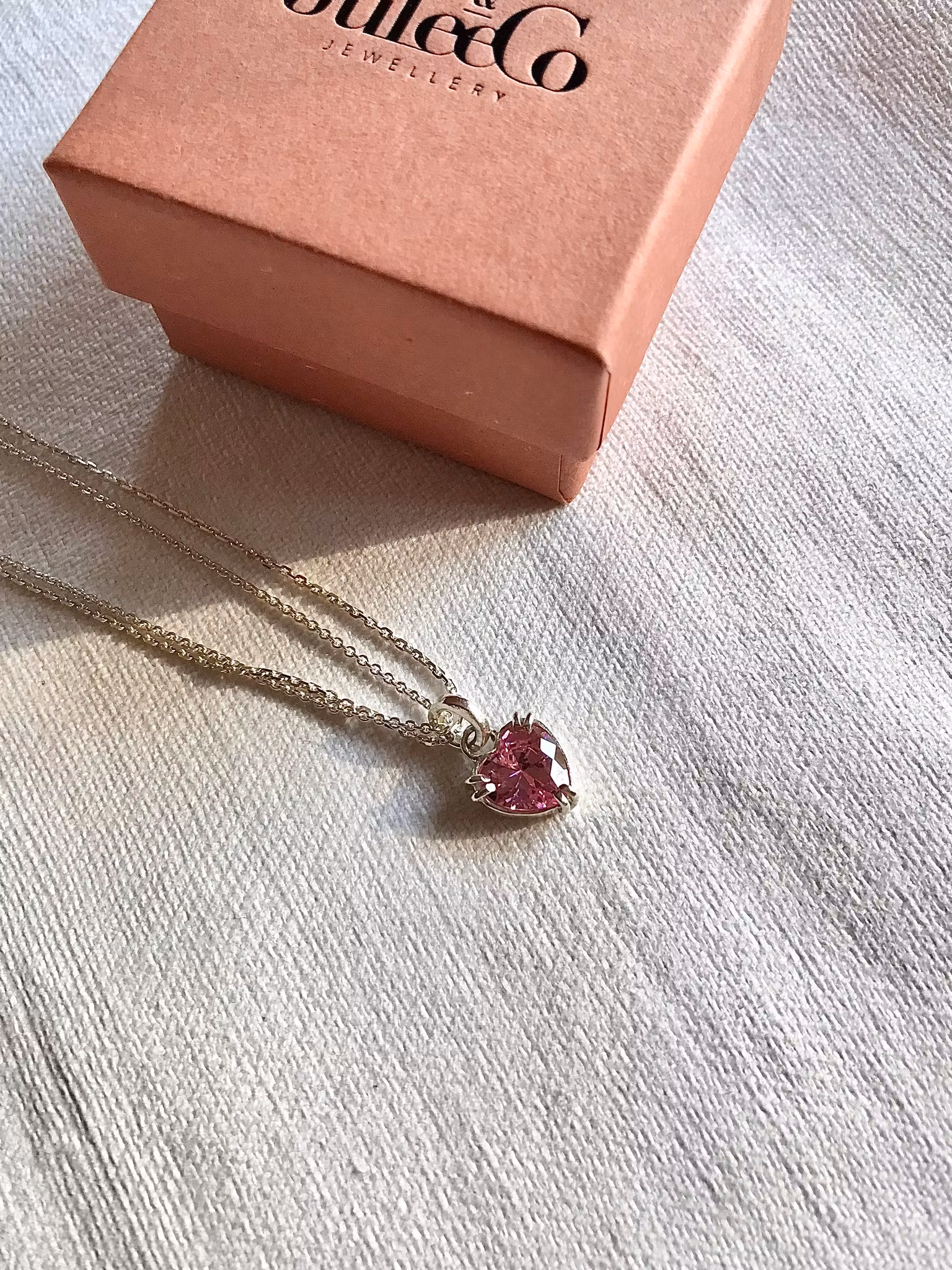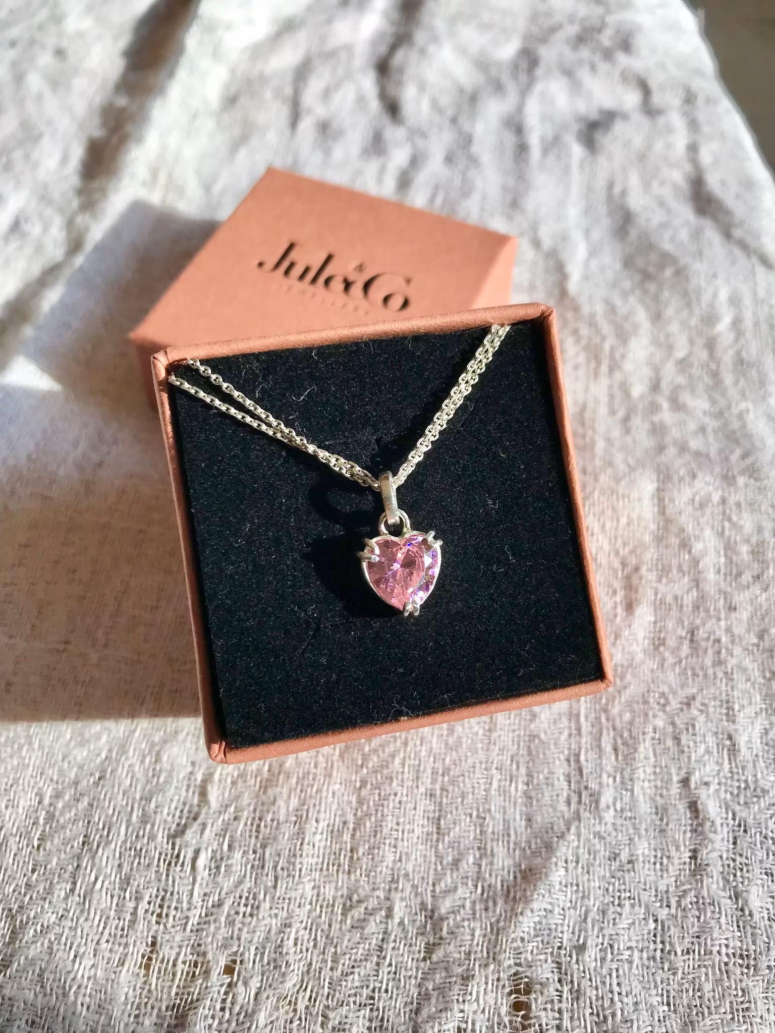 Hjärtformad hänge i ljusrosa sten av Cubic Zirconia. Passar perfekt till present att ge till någon du tycker om.