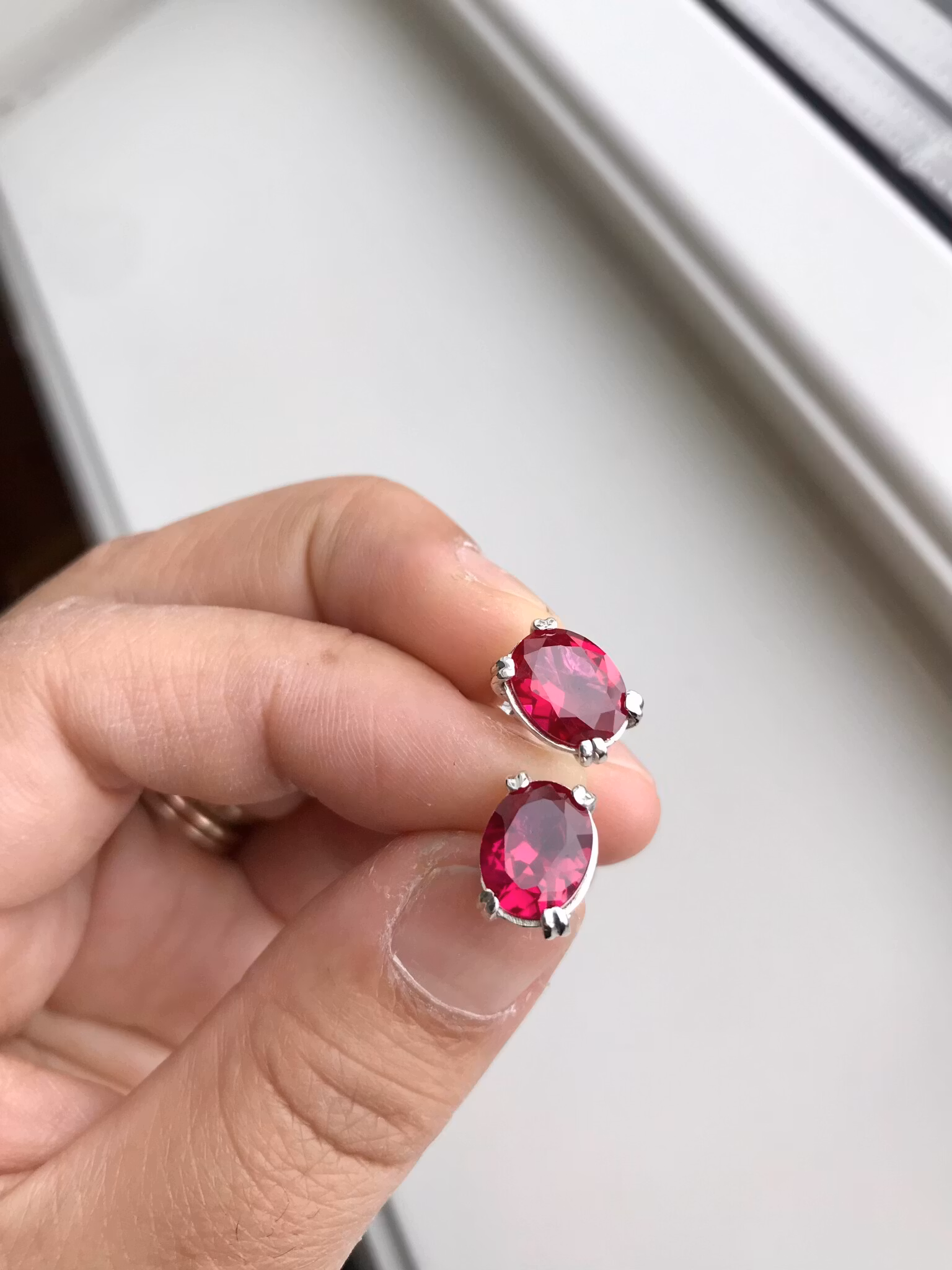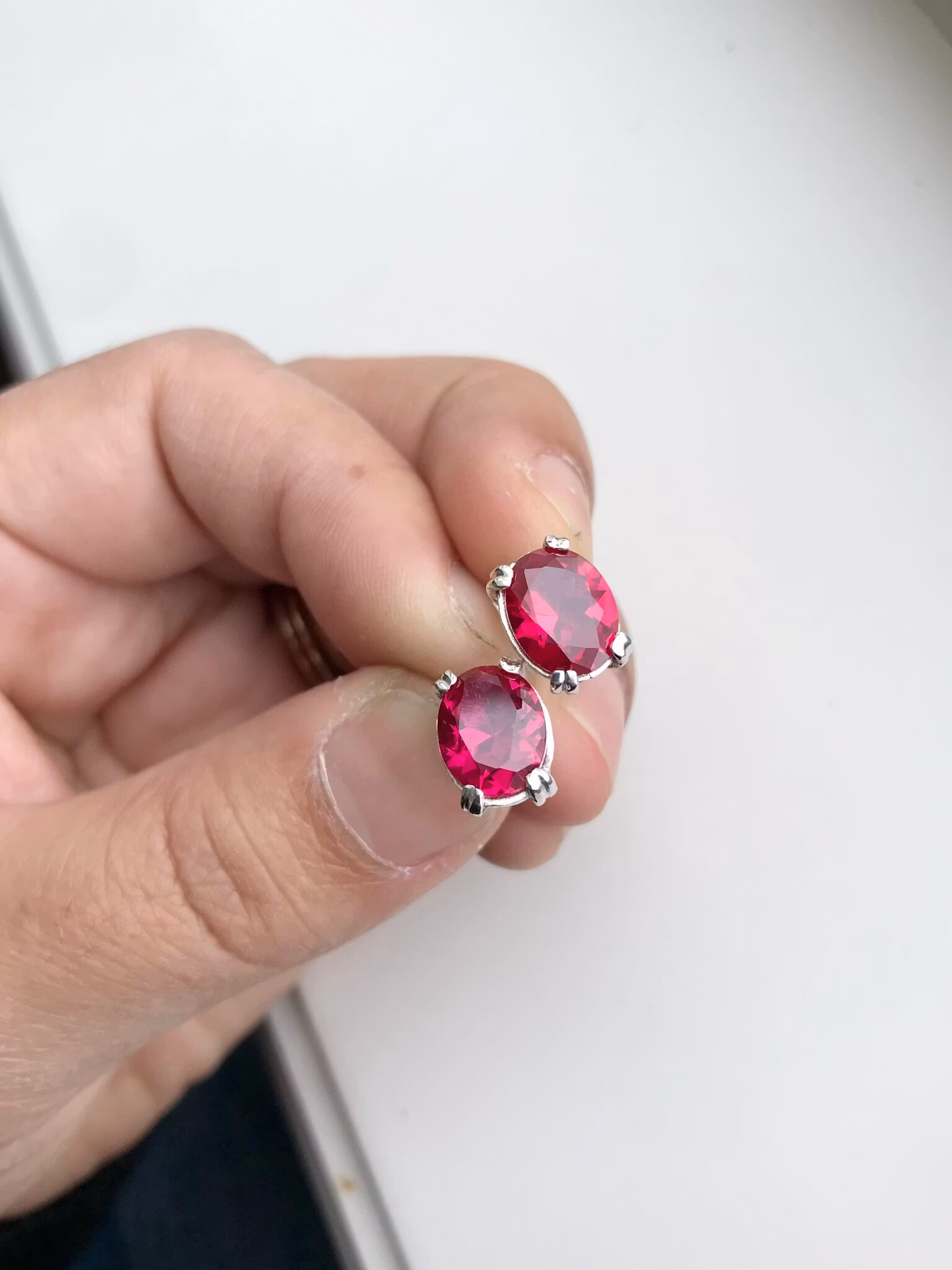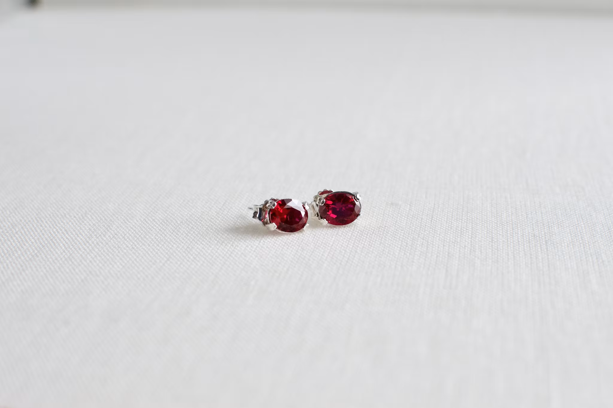 Ett par stift örhängen med labb tillverkade rubiner. Tidlös vackra örhängen med en blandning av vintage och modern känsla i de.