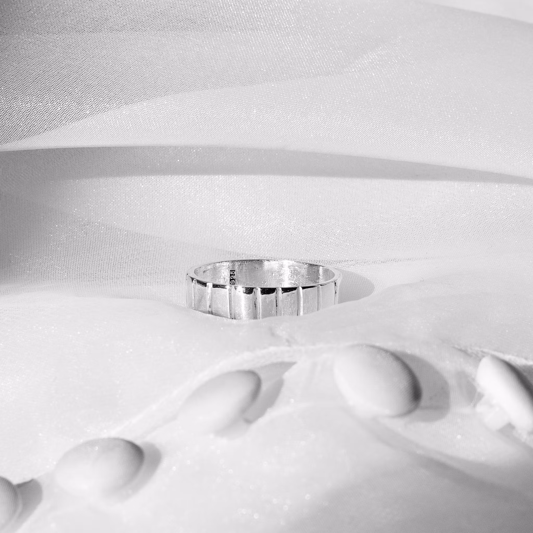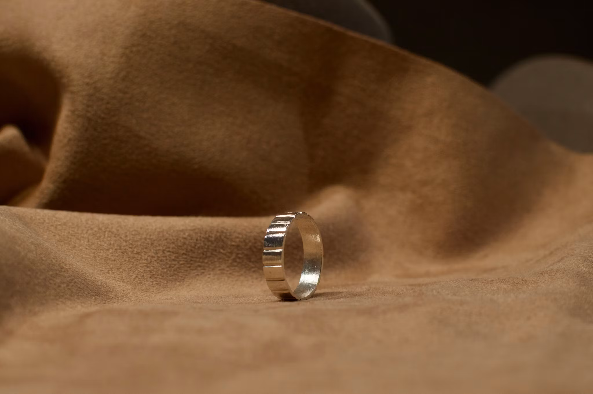 En unisex ring med randiga detaljer perfekt för någon som vill ha en tidlös detalj på en klassisk ring, även perfekt som vigsel-/förlovningsring. Mått: 6x1,5mm. Välj mellan 18 karat ljus guld eller sterling silver.